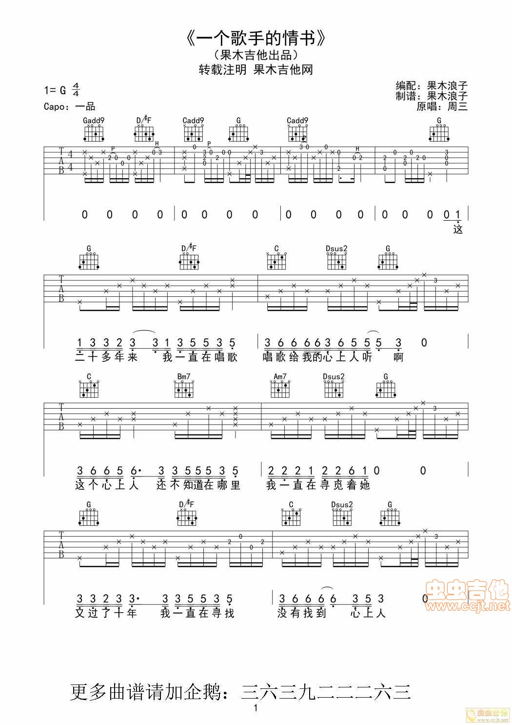 曲谱介绍: 周三《一个歌手的情书》吉他弹唱谱,共有5张高清图谱。