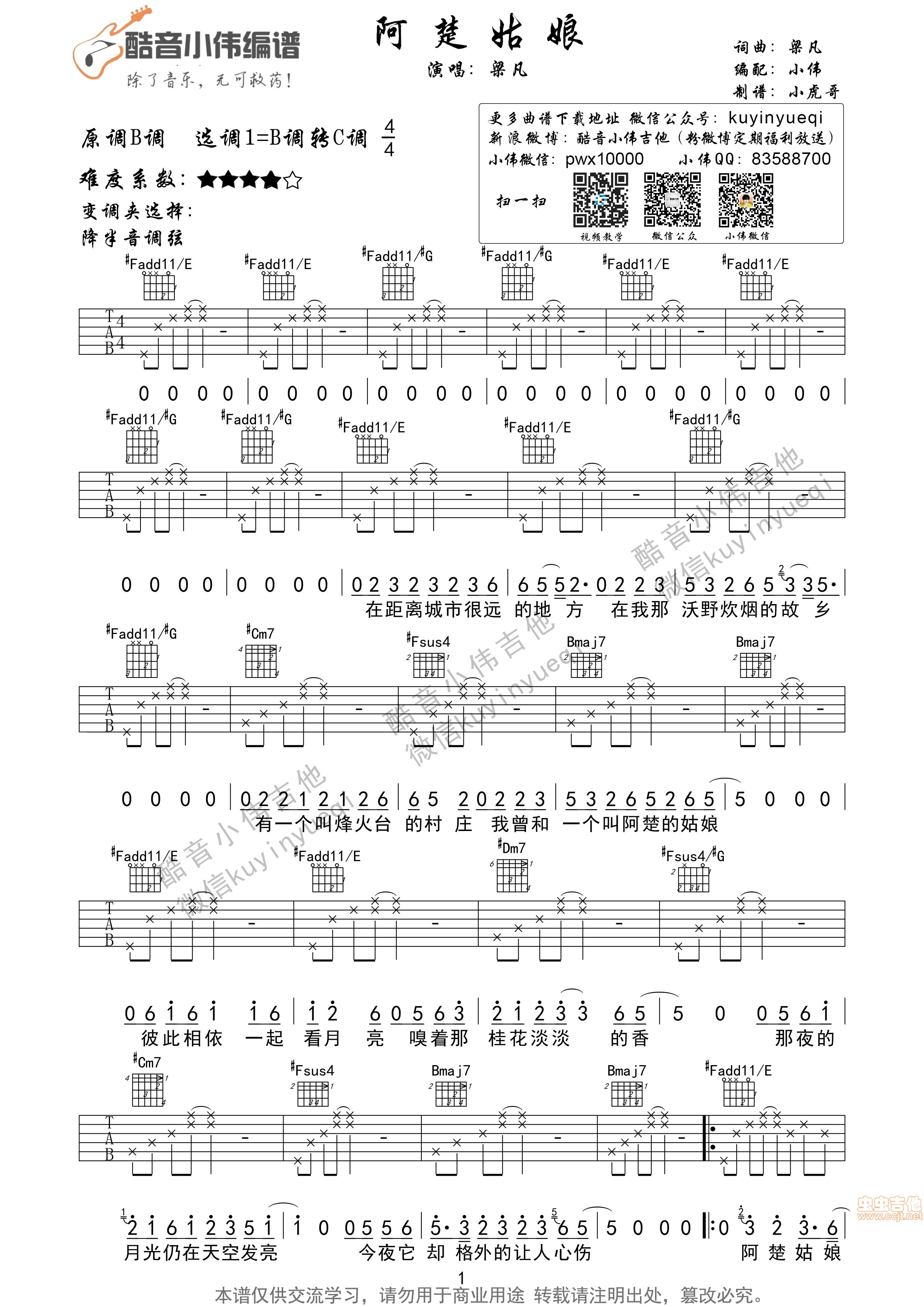 曲谱介绍: 《阿楚姑娘》吉他弹唱谱,共有3张高清图谱。
