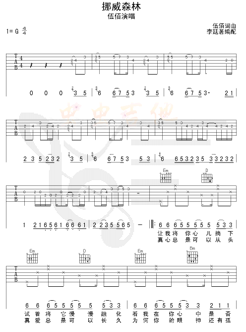 曲谱介绍: 《挪威森林》吉他弹唱谱,共有5张高清图谱。