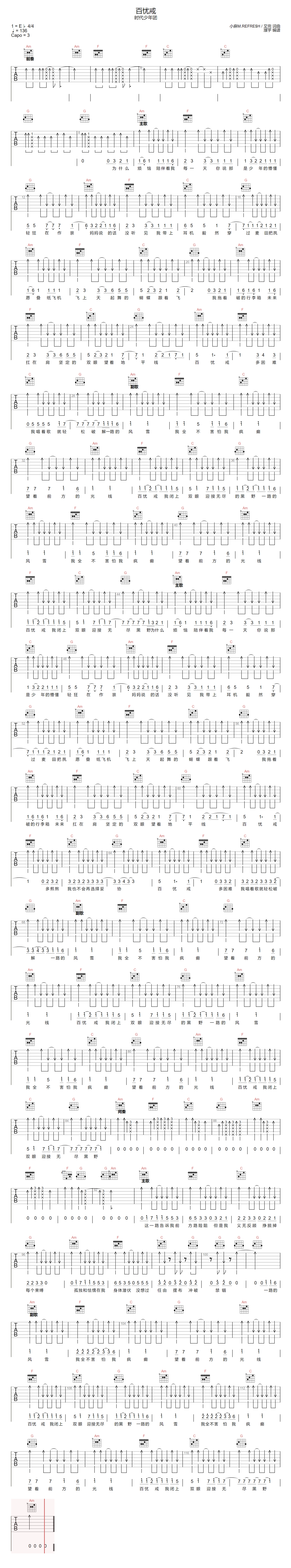 曲谱介绍: 吉他谱介绍:百忧戒吉他谱,时代少年团演唱的一首歌曲,4/4拍的节奏,这首歌曲的原调为降E调,这里曲谱采用了C调指法进行编配,演唱时夹变调夹3品可回到原调,也可根据个人实际嗓音情况选择。曲谱由琴谱网更新上传,共1张高清图片弹唱吉他谱例,来源于@濮宇编配出品。这首歌曲风高燃励志,歌词的叙事感很强,讲述了少年们在三年的时间里,为了梦想义无反顾地冲破禁锢,去找寻存在的意义和价值。