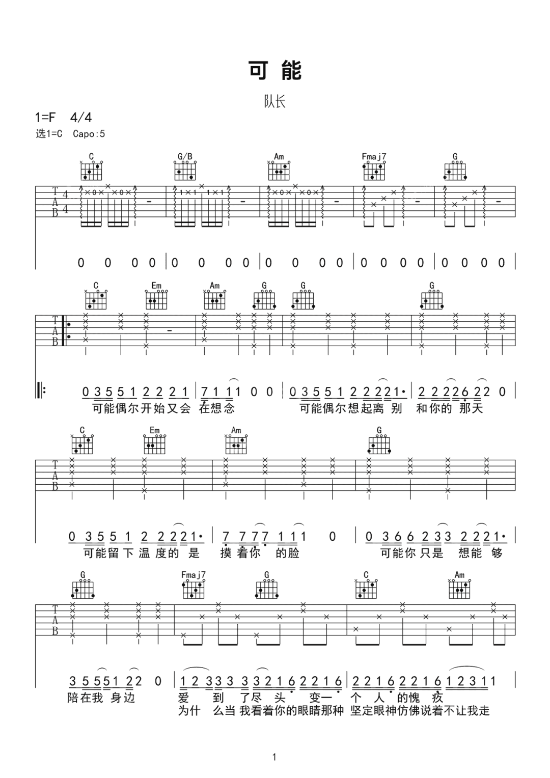 可能吉他谱 - 队长 - C调吉他弹唱谱 - 原版