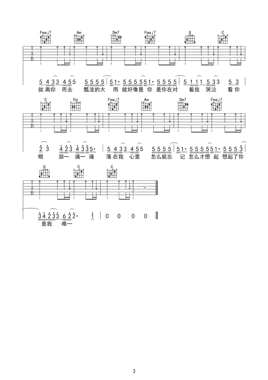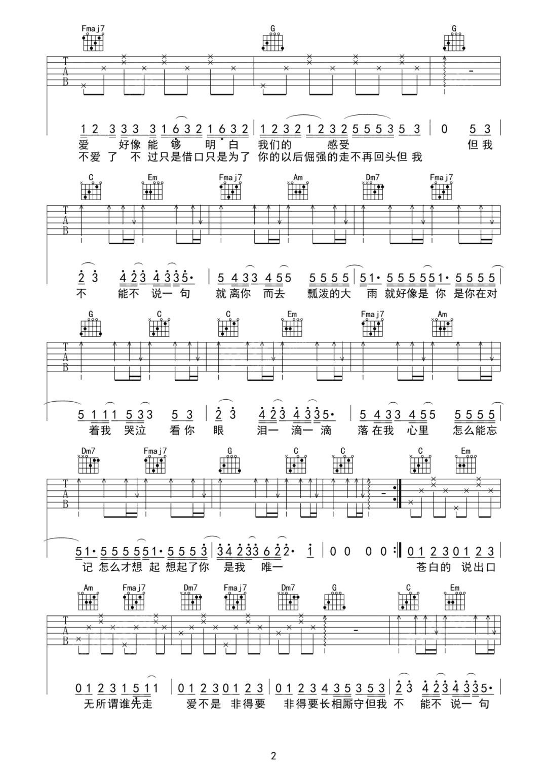 曲谱介绍: 吉他谱介绍:可能吉他谱,队长演唱的一首歌曲,4/4拍的节奏,这首歌曲的原调为F调,这里曲谱采用了C调指法进行编配,演唱时夹变调夹5品可回到原调,也可根据个人实际嗓音情况选择。曲谱由琴谱网更新上传,共3张高清图片弹唱吉他谱例,曲谱来源于网络转载,编配制谱者暂不详。“可能偶尔开始又会在想念,可能偶尔想起离别和你的那天,可能留下温度的是摸着你的脸,可能你只是想能够陪在我身边。”