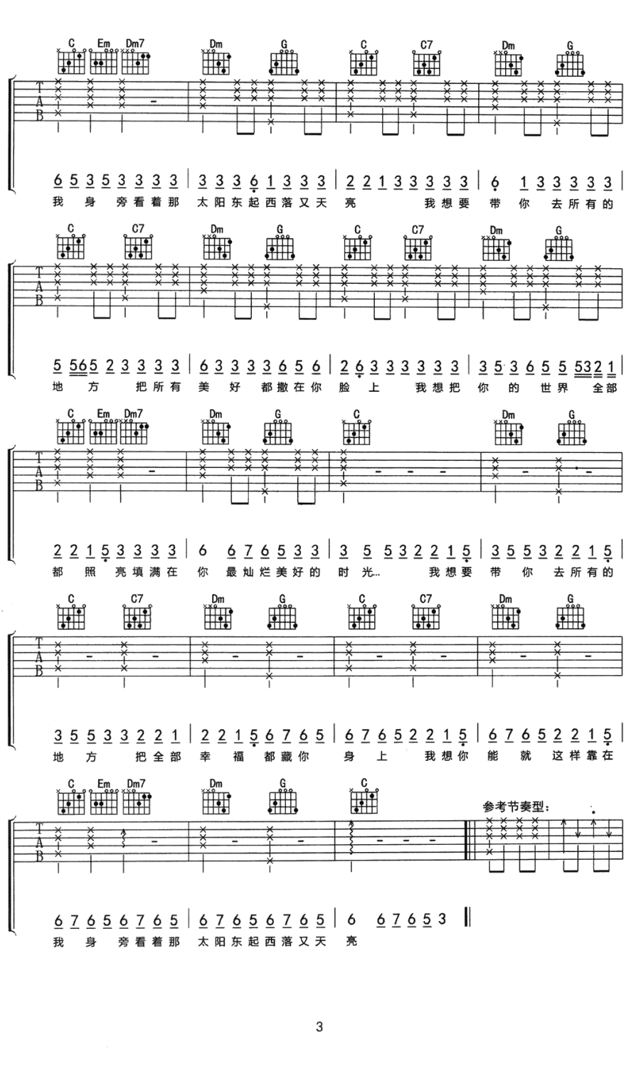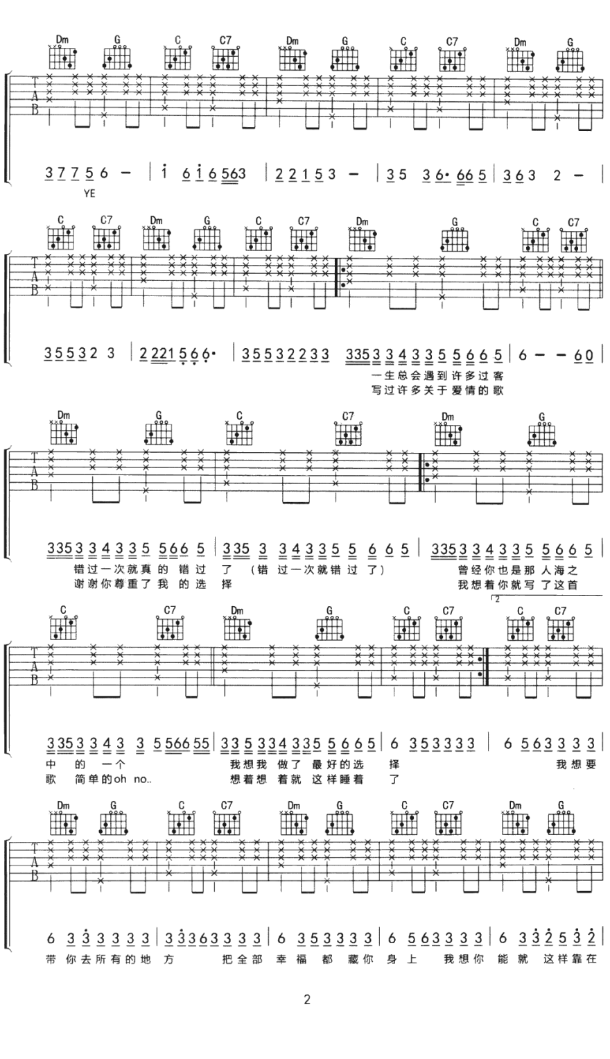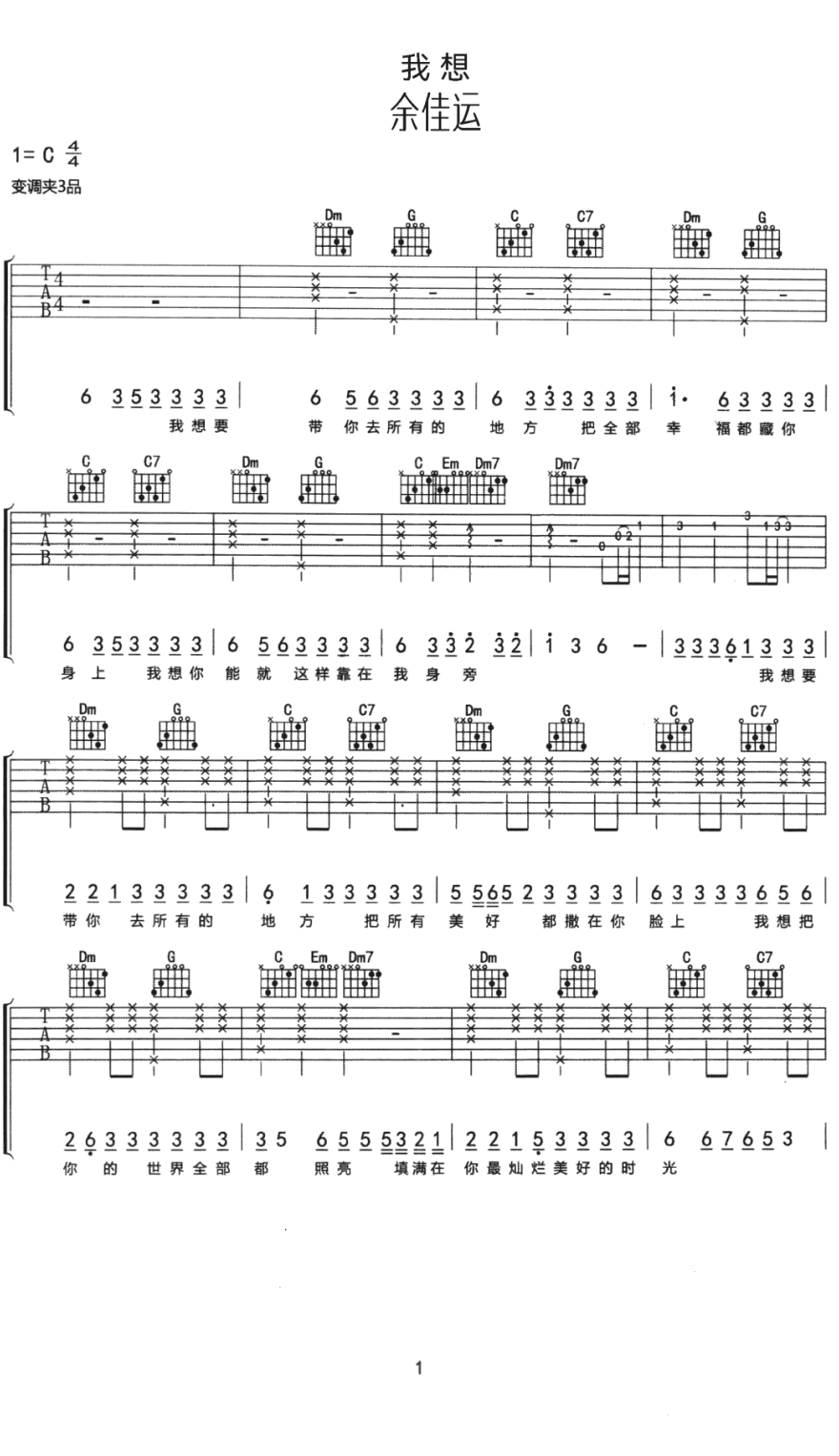 曲谱介绍: 余佳运《我想C调》吉他弹唱谱,采用C调指法编配,共有3张高清图谱。