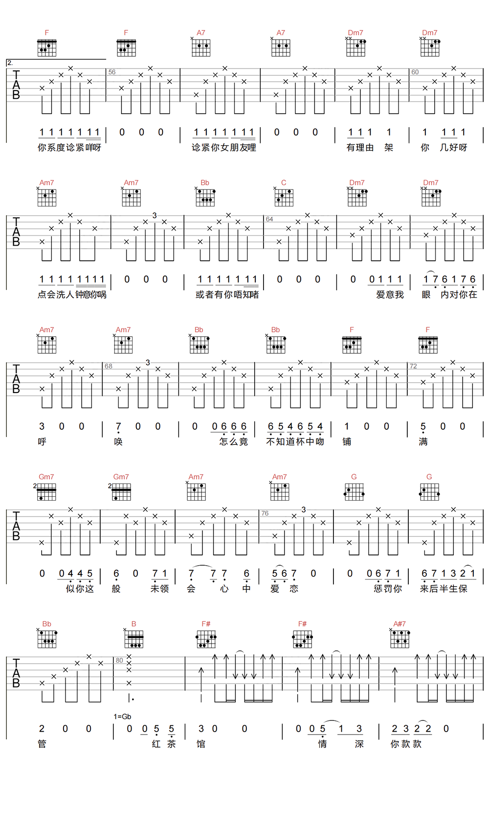 曲谱介绍: 陈慧娴《红茶馆》吉他弹唱谱,采用F调指法编配原版,共有4张高清图谱。