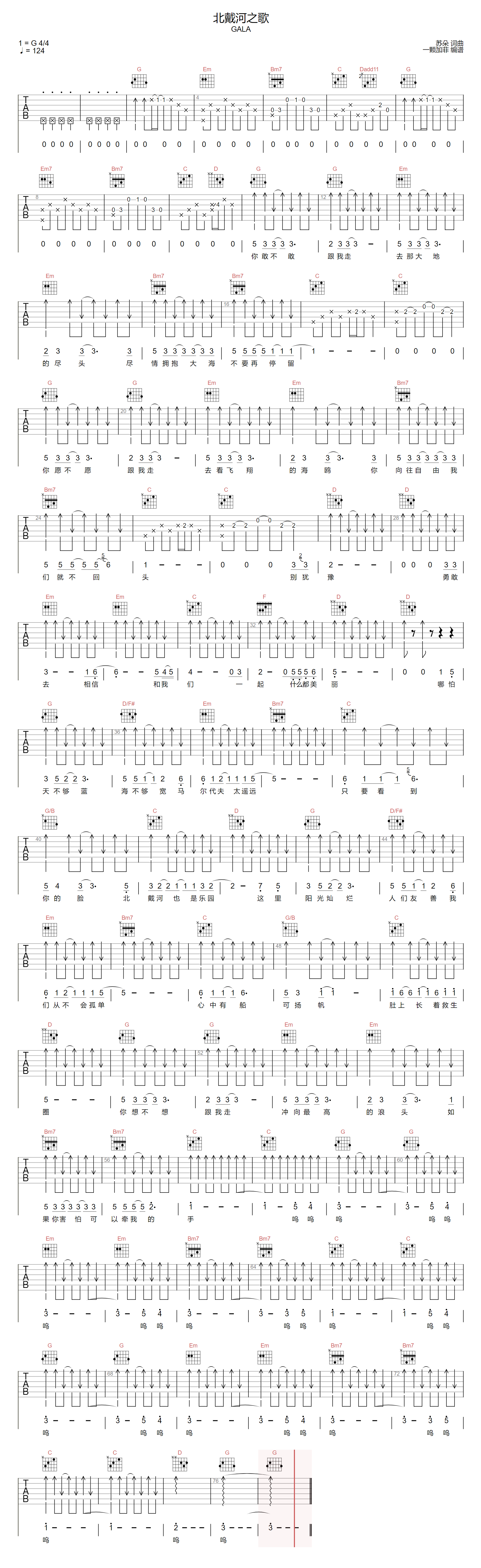 曲谱介绍: 吉他谱介绍:北戴河之歌吉他谱,GALA演唱的一首歌曲,4/4拍的节奏,这首歌曲的原调为G调,这里曲谱采用了G调指法进行编配,演唱时可不夹变调夹,曲谱由琴谱网更新上传,共1张高清图片弹唱吉他谱例,琴谱网整理发布。这首歌是电影《深海》的插曲,北戴河正是影片男主“南河”的家乡。歌曲为影片中参宿正式加入“深海大饭店”的片段插曲,极具快乐治愈力。