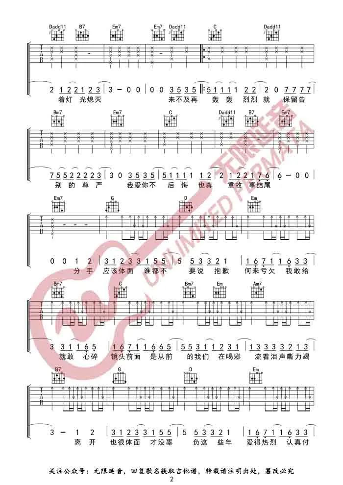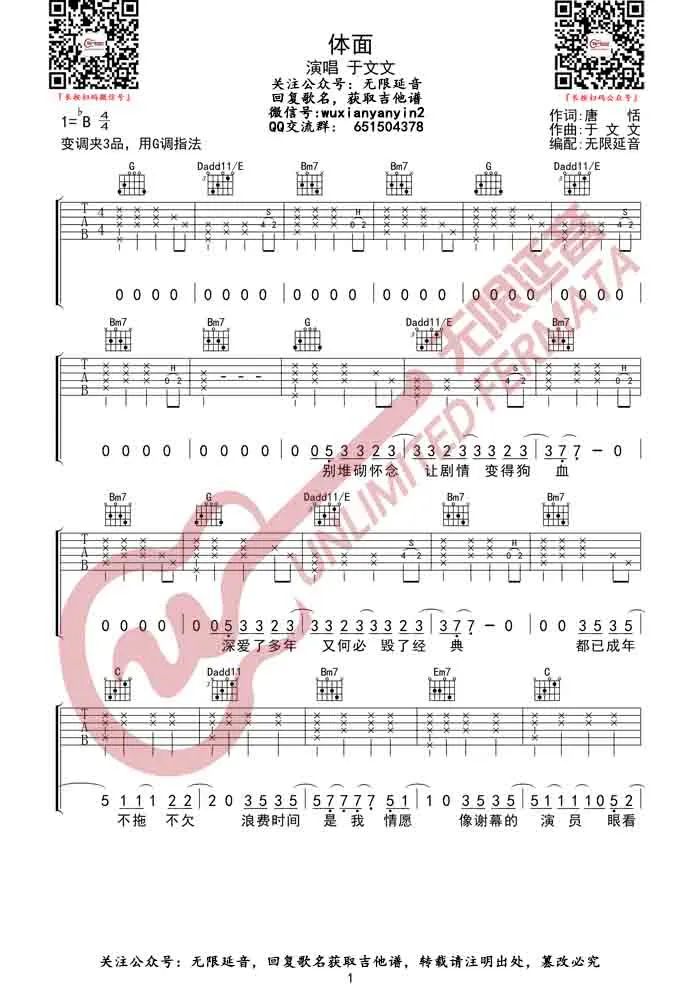 曲谱介绍: 吉他谱介绍:体面吉他谱,于文文演唱的一首歌曲,4/4拍的节奏,这首歌曲的原调为降B调,这里曲谱采用了G调指法进行编配,演唱时夹变调夹3品可回到原调,也可根据个人实际嗓音情况选择。共3张高清图片弹唱吉他谱例,琴谱网整理发布。于文文对歌曲的整体把握张弛有度,配合其独具特色磁性的嗓音与歌曲的旋律完美结合,使歌声极具感染力,直击人心。