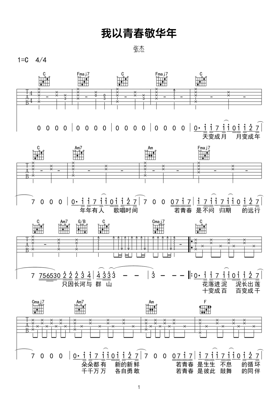 我以青春敬华年吉他谱 - 张杰 - C调吉他弹唱谱 - 原版