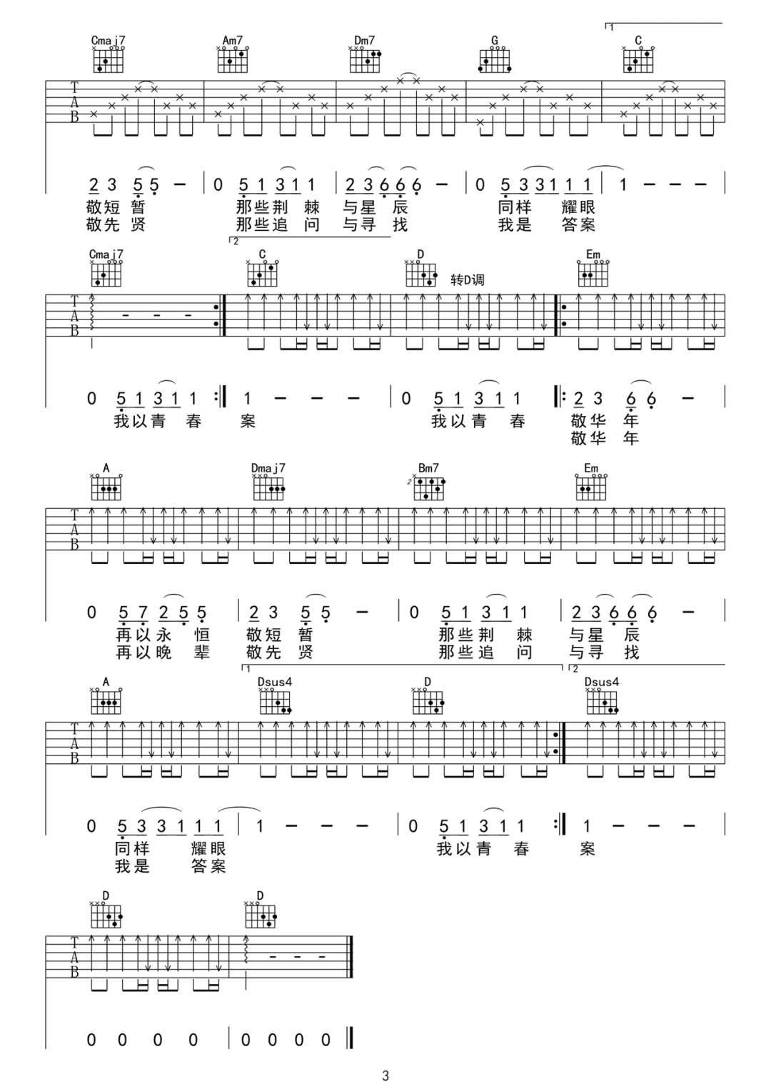 曲谱介绍: 吉他谱介绍:我以青春敬华年吉他谱,张杰演唱的一首歌曲,4/4拍的节奏,这首歌曲的原调为C调,这里曲谱采用了C调指法进行编配,演唱时可不夹变调夹,共3张高清图片弹唱吉他谱例,曲谱来源于网络转载,编配制谱者暂不详。在这首歌曲中,张杰以深情的演唱,勾勒出一代代青年“奋斗的青春”,娓娓道出对于时光的追问与答案。