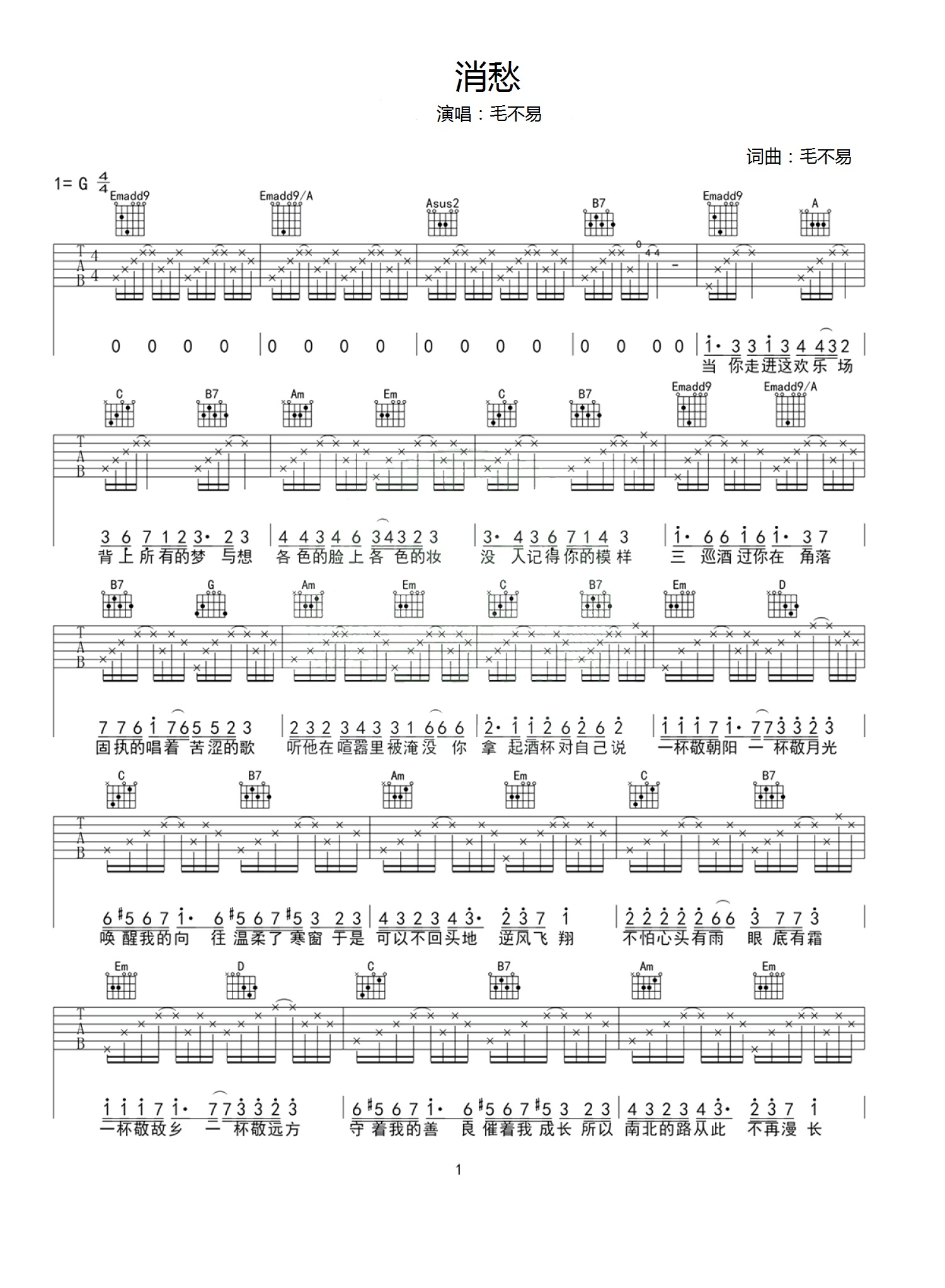 消愁吉他谱 - 毛不易 - G调吉他弹唱谱