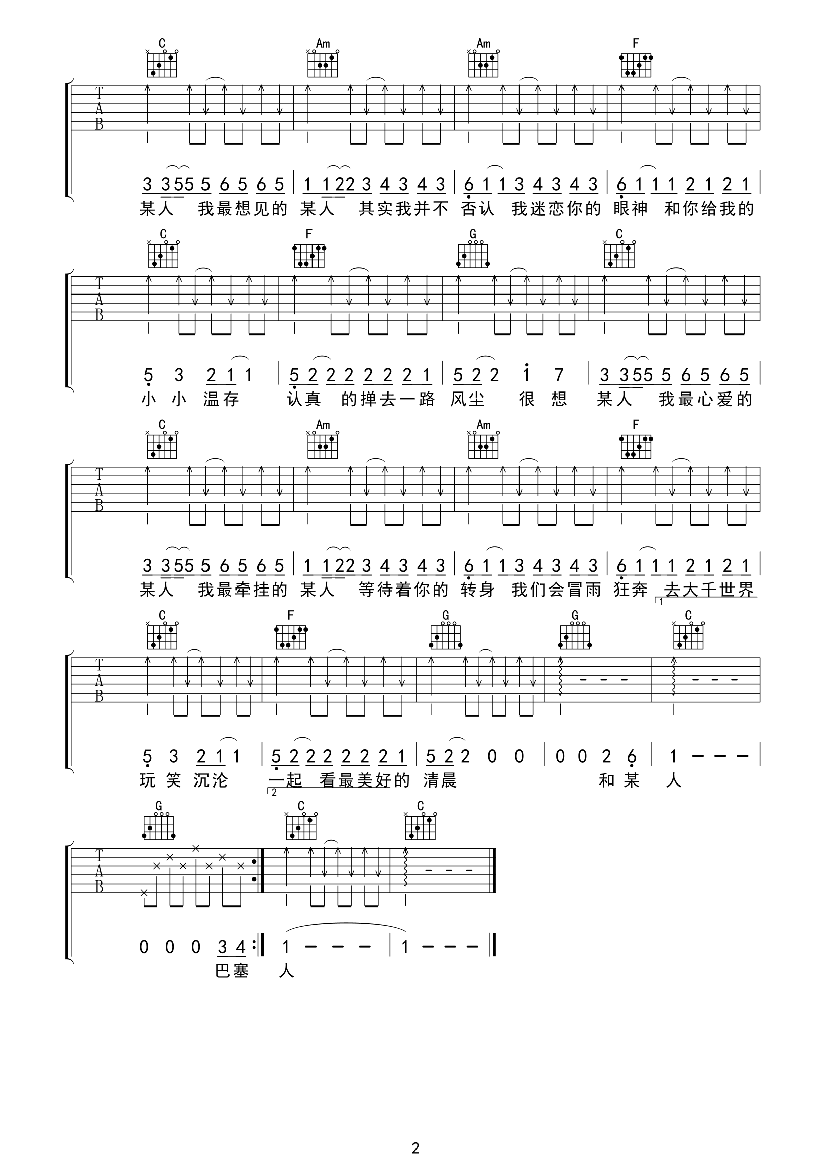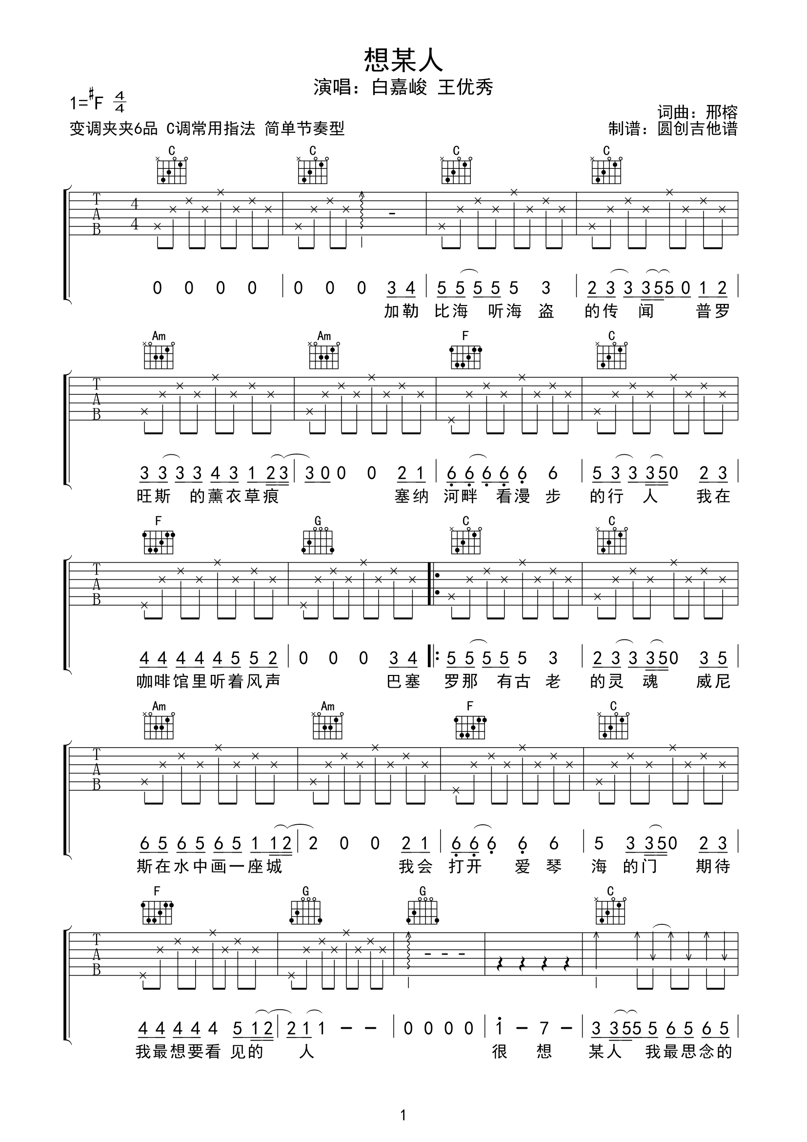 曲谱介绍: 白嘉峻《想某人》吉他弹唱谱,采用C调指法编配,共有2张高清图谱,免翻页排版设计。