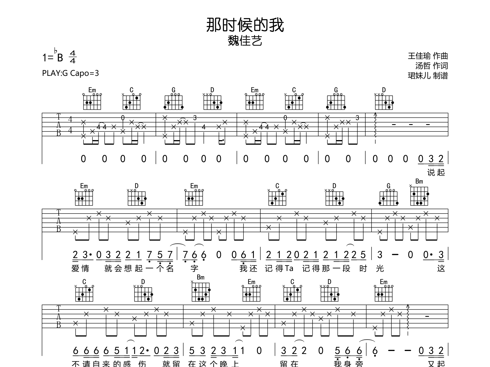 曲谱介绍: 那时候的我吉他谱,魏佳艺演唱,那时候的我吉他弹唱谱,由珺妹儿编配制谱,本吉他谱用G调指法编,弹唱建议变调夹3品,速度85BPM,难度较简单,易上手,共有2张图片谱。