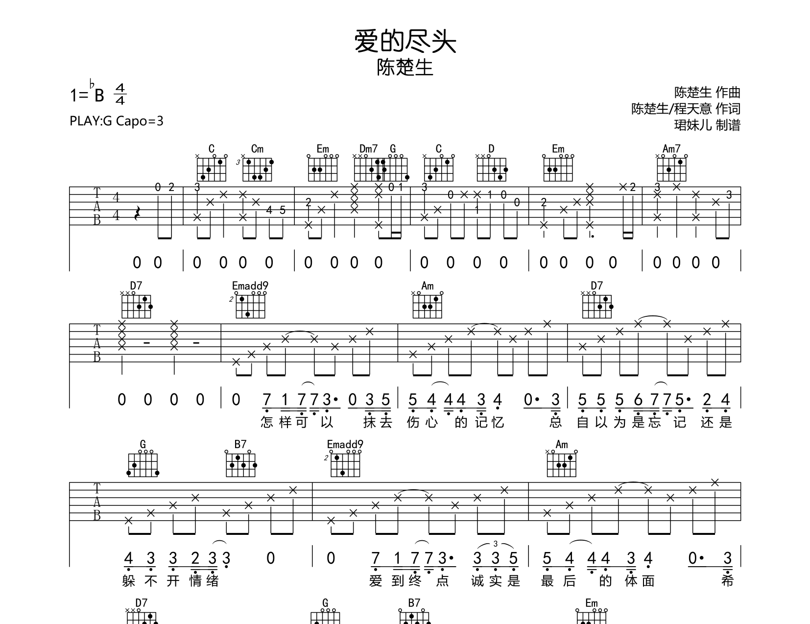 曲谱介绍: 爱的尽头吉他谱,陈楚生演唱,爱的尽头吉他弹唱谱,由珺妹儿编配制谱,本吉他谱用G调指法编,弹唱建议变调夹3品,速度75BPM难度较简单,易上手,共有3张图片谱。