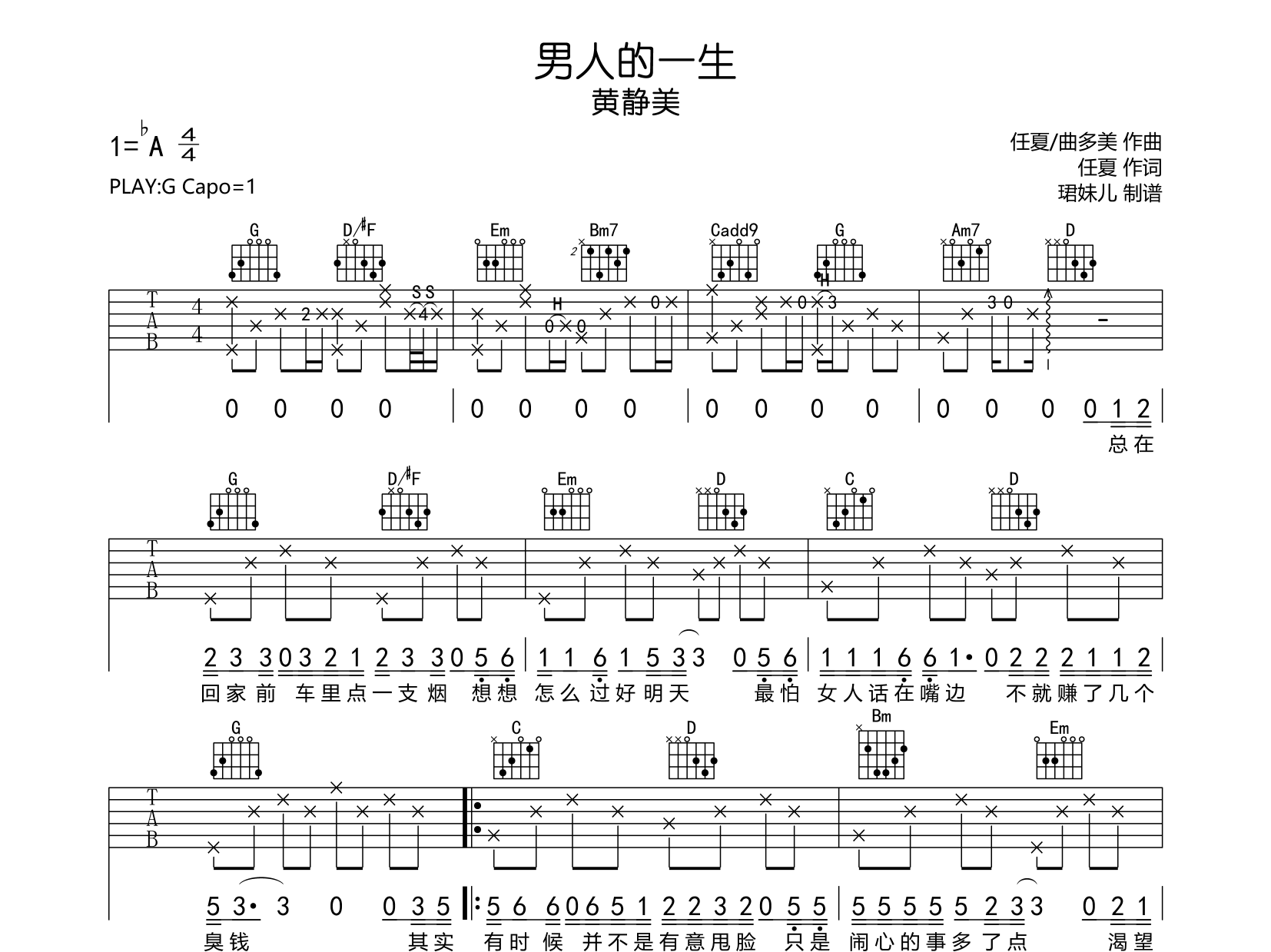 曲谱介绍: 男人的一生吉他谱,黄静美演唱的一首歌曲,男人的一生吉他弹唱谱,由珺妹儿编配制谱,本吉他谱用G调指法编,弹唱建议变调夹1品,速度85BPM难度较简单,易上手,共有2张图片谱。