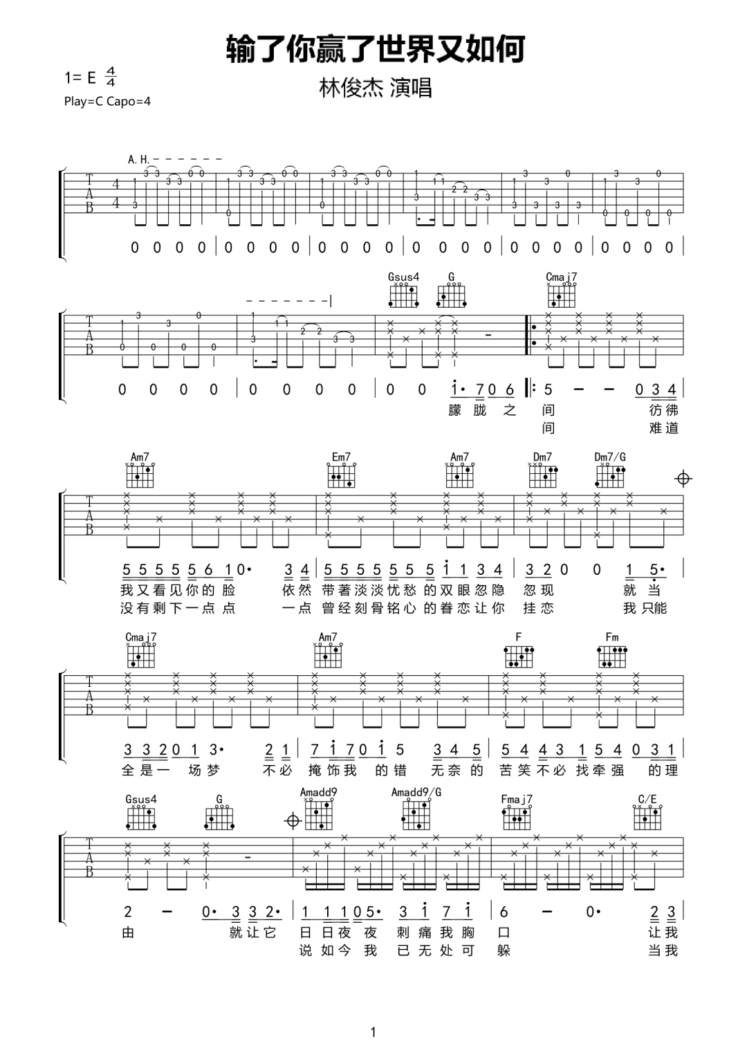 输了你赢了世界又如何吉他谱 - 林俊杰 - C调吉他弹唱谱