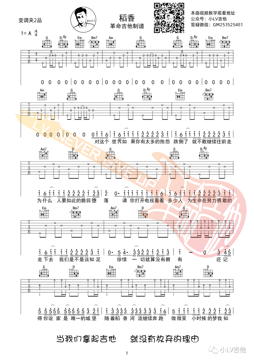 曲谱介绍: 吉他谱介绍:稻香吉他谱,周杰伦演唱的一首歌曲,4/4拍的节奏,这首歌曲的原调为A调,这里曲谱采用了G调指法进行编配,演唱时夹变调夹2品可回到原调,也可根据个人实际嗓音情况选择。共4张高清图片弹唱吉他谱例,来源于@革命吉他编配出品。这首歌MV中可以看出周杰伦各地取材的元素,造型上民俗风格的打扮是周杰伦在泰国拍完广告后带回来的服装。MV中的木箱则是源自中南美洲的乐器“木箱鼓”。 稻香吉他弹唱教学