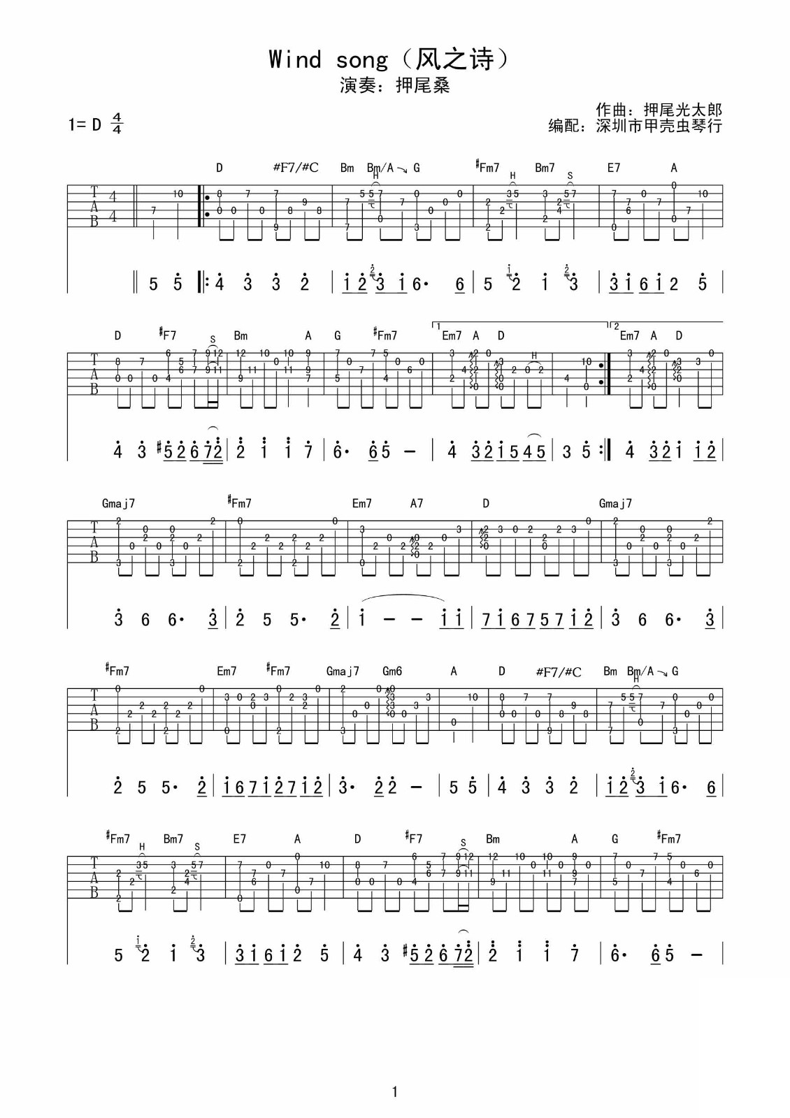 曲谱介绍: 吉他谱介绍:风之诗指弹吉他谱,押尾桑的一首指弹吉他曲目,这首曲子采用的是标准调弦,4/4拍的节奏,无需特殊调音。演奏时可不夹变调夹,共2张高清图片指弹吉他谱例,来源于@甲壳虫琴行编配出品。这首曲子是一首非常舒缓耐听的日系指弹曲子,此版本是完全根据原版编配而来,包括技巧和指法等等,但在原版曲谱的基础上将和弦标注出来了,让练习者们能够很好的安排指法。
