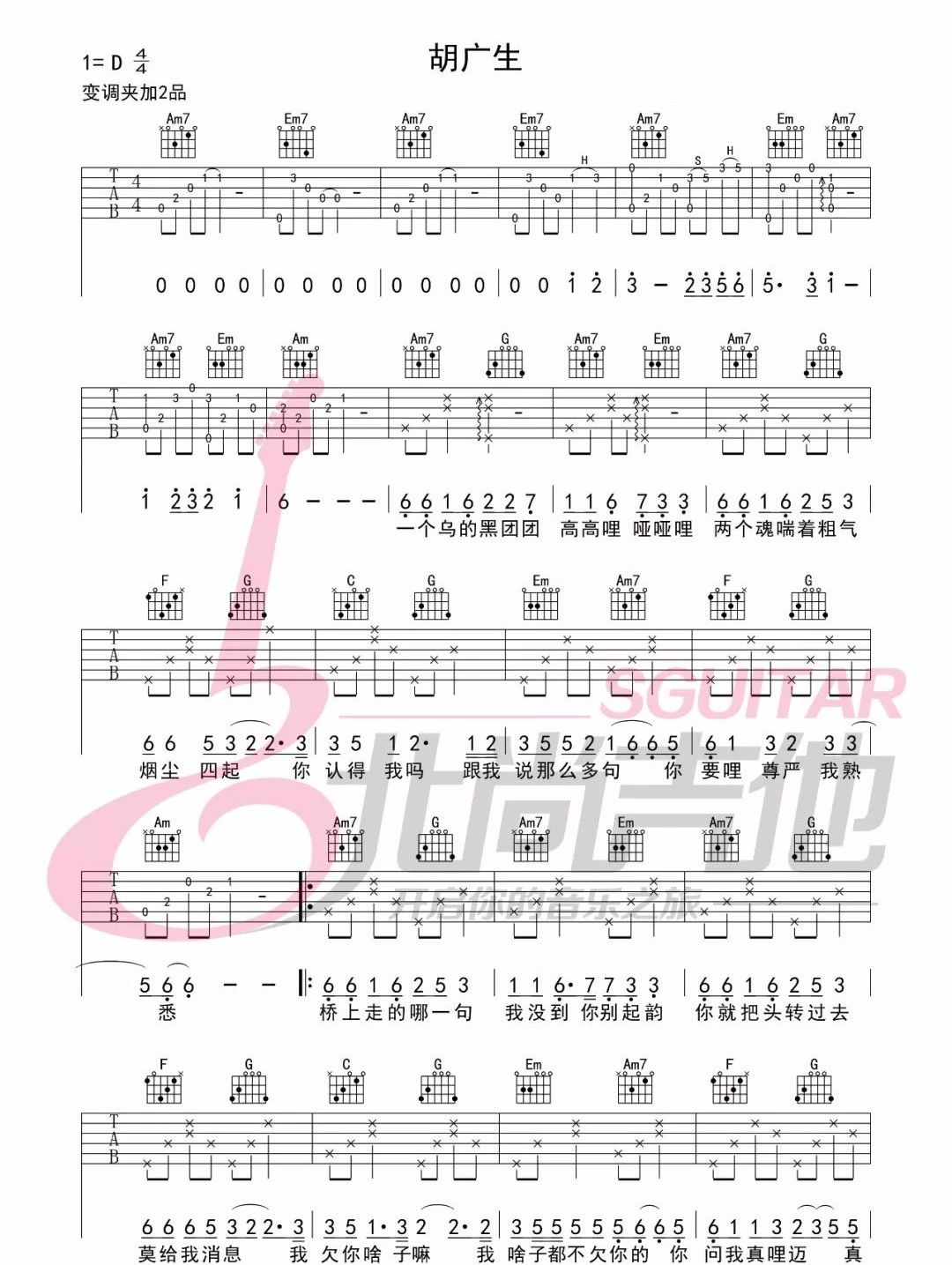 曲谱介绍: 吉他谱介绍:胡广生吉他谱,任素汐演唱的一首歌曲,4/4拍的节奏,这首歌曲的原调为D调,这里曲谱采用了C调指法进行编配,演唱时夹变调夹2品可回到原调,也可根据个人实际嗓音情况选择。共2张高清图片弹唱吉他谱例,来源于@北尚吉他编配出品。这首歌是剧中人物马嘉祺写给胡广生的,歌词中写到:一个乌的黑团团,高高哩哑哑哩,两个魂喘着粗气,烟尘四起。