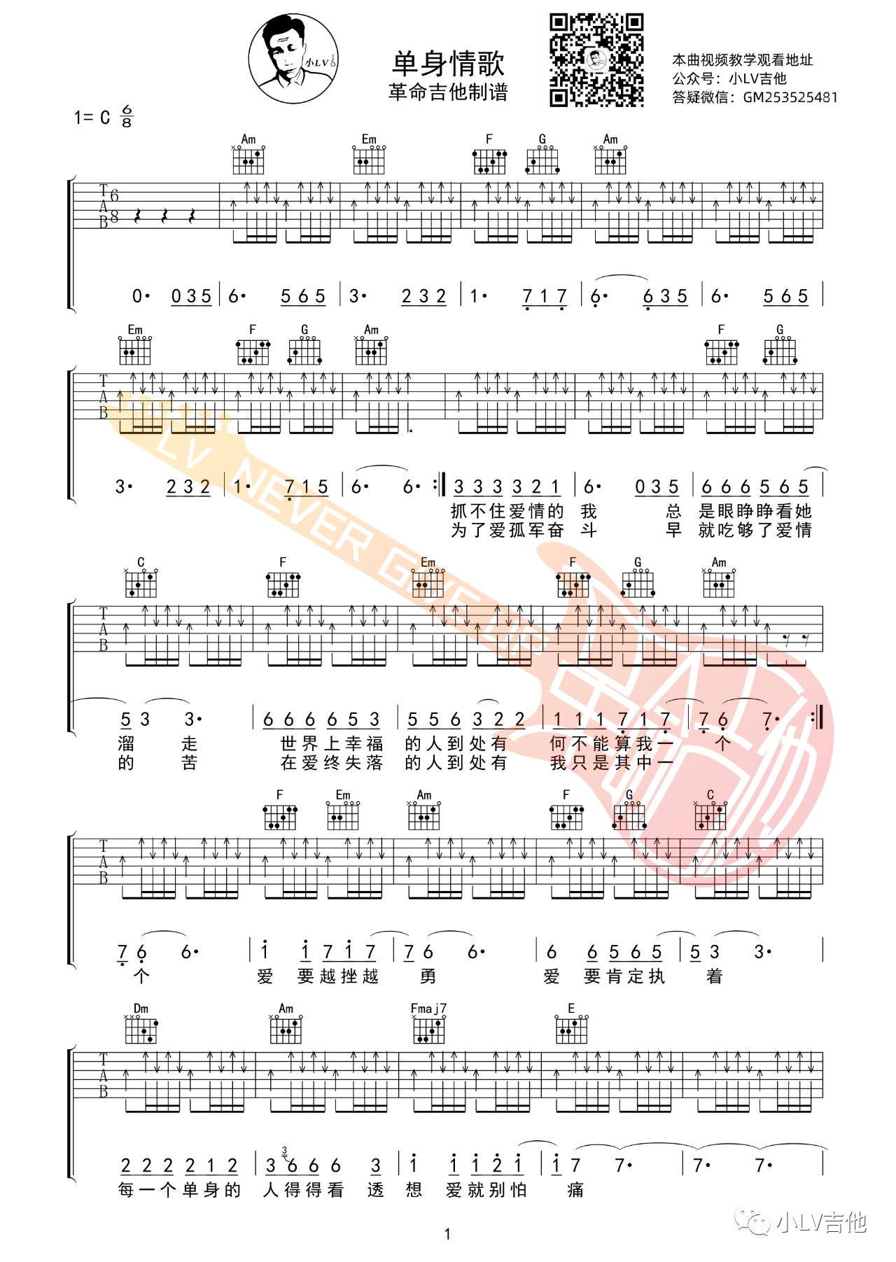 曲谱介绍: 林志炫经典伤感情歌《单身情歌》,在感情里受伤是不可避免的,找一个人来给自己伤痕,也是成长的过程。错落有致的旋律,流畅而不平庸,是对单身的宣泄,既渴望爱情又抚慰励志。单身情歌吉他谱分享,C调指法版吉他六线谱,来自小LV老师编配制谱。这首歌是6/8拍的节奏,右手部分只用到一种节奏型 ↓ ↓↑ ↓↑的伴奏指法,左手部分只用到Am、Em、C、F、G这几个和弦,难度较低,适合新手朋友。
