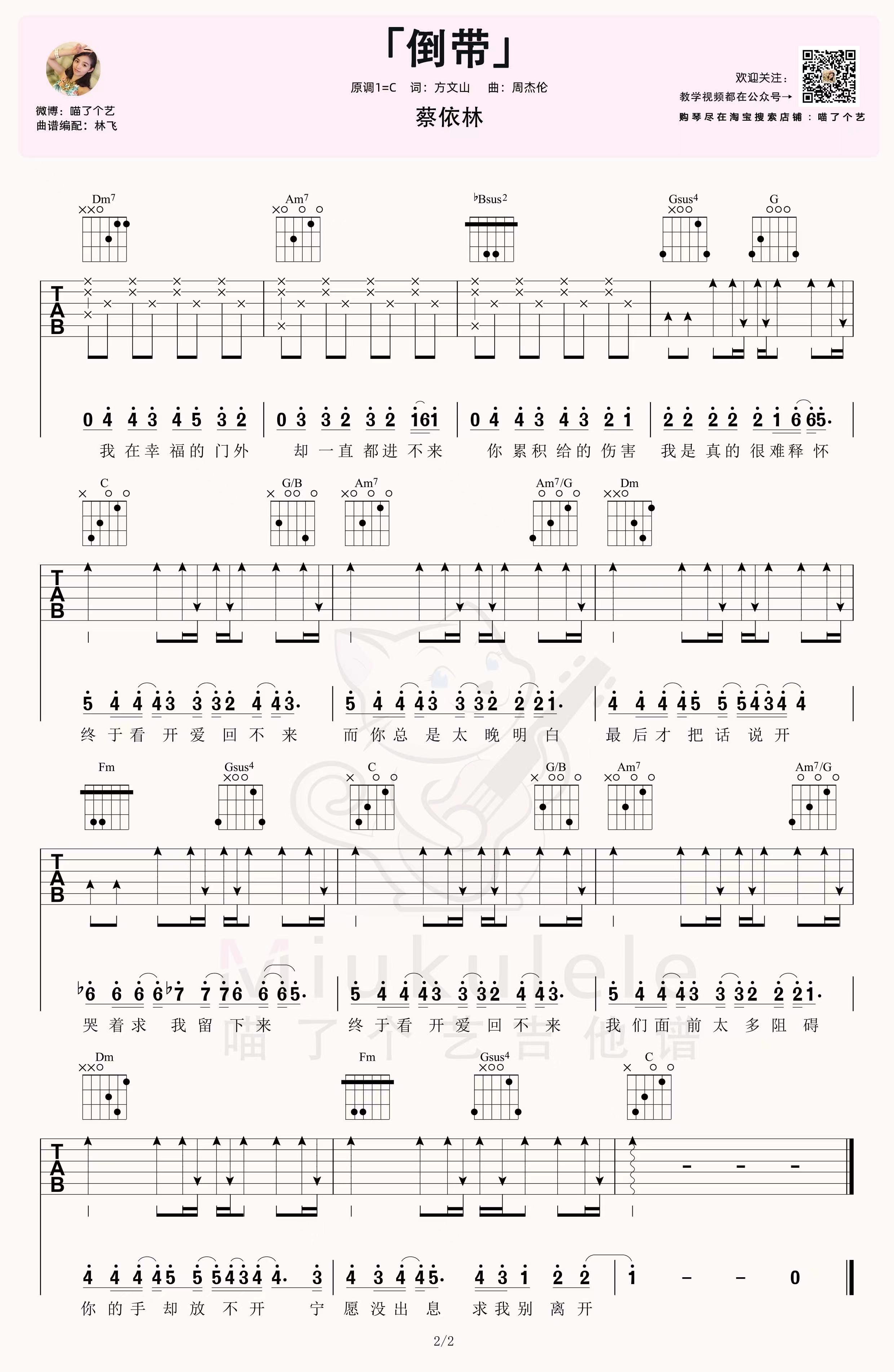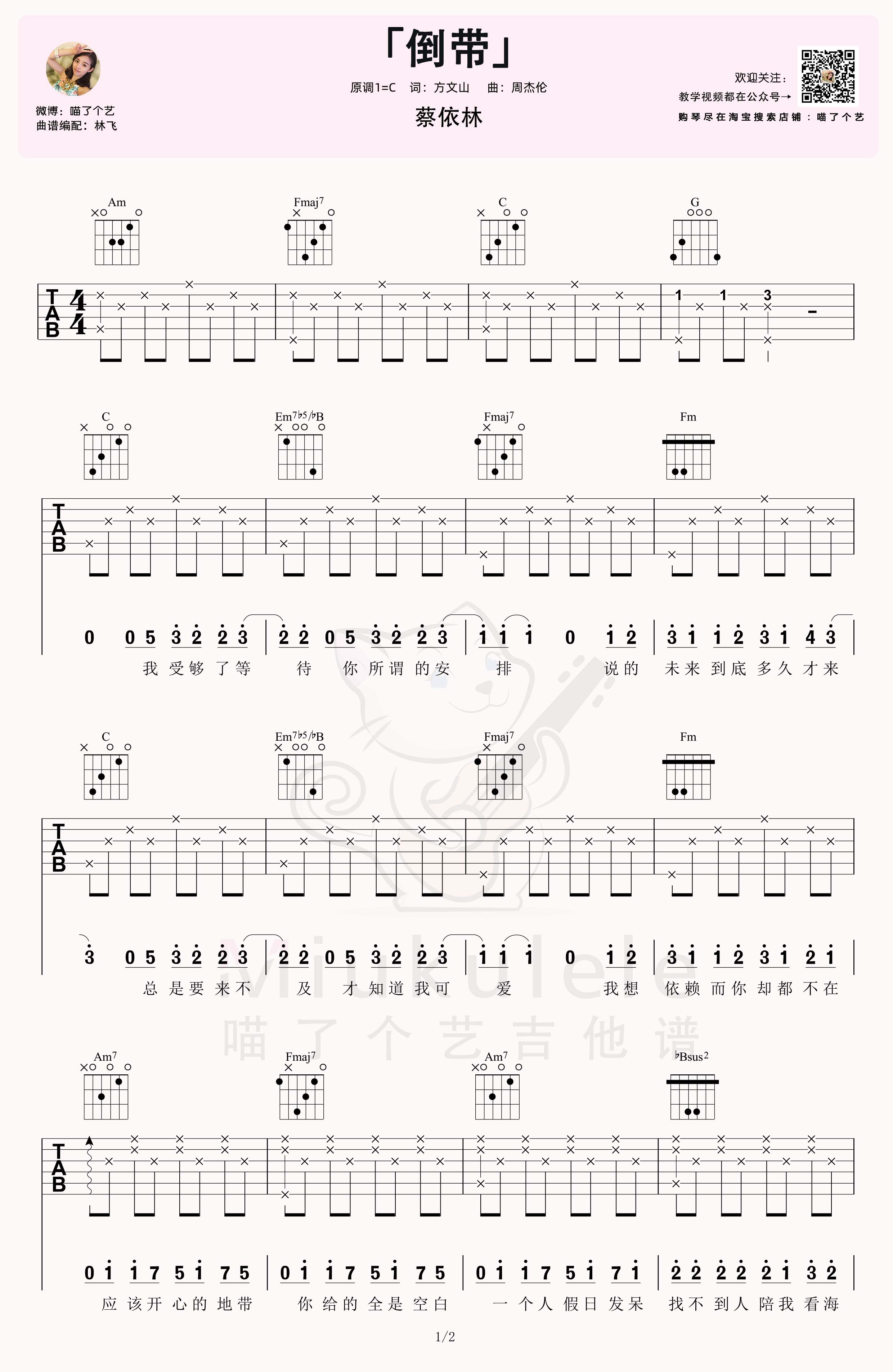 曲谱介绍: 终于看开爱回不来,而你总是太晚明白。周杰伦《倒带》,人生不能倒带,也不必倒带,因为你会有更好的未来!倒带吉他弹唱谱,来自喵了个艺编配弹唱伴奏谱,高清六线谱格式,两张图片谱例。这首歌的演奏节奏型较为简单,小白也能轻松上手,附教学讲解教程,零基础的琴友请在视频里学习详细的指法。