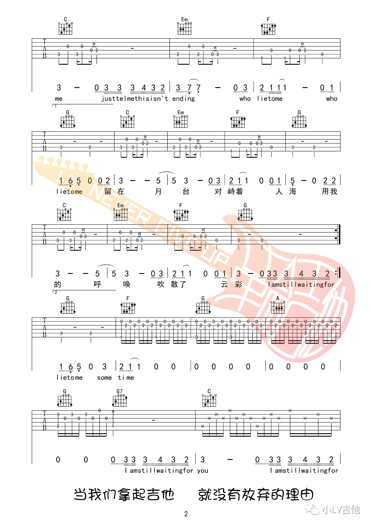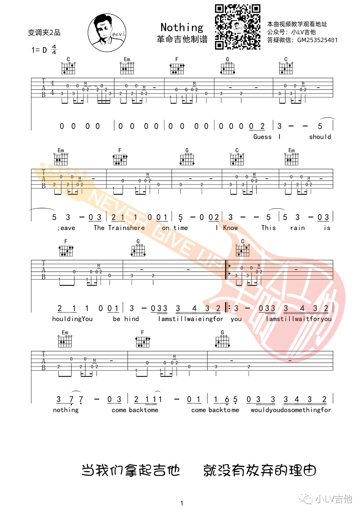 曲谱介绍: 薛之谦新歌《Nothing》,“I am still waiting for you”,是对万物的期盼,也是对情感的执念。我们在等待,在追逐,纵使伤痛,不曾放弃。人生空无,亦有悬悬而望,Nothing,除了你,什么都没有。Nothing吉他谱,C调版吉他弹唱谱,来自小LV老师编配弹唱谱,唱原调变调夹夹第二品。歌曲演奏大量运用了击弦的指法,初学者注意把握好力度,多找找感觉。