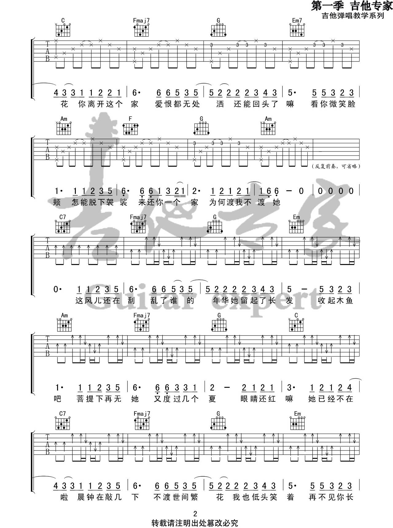 曲谱介绍: 苏谭谭演唱的一首歌曲,4/4拍的节奏,这首歌曲的原调为C调,这里曲谱采用了C调指法进行编配,演唱时可不夹变调夹,曲谱由琴谱网更新上传,来源于@吉他专家编配出品。不得不承认,大家对于古典优美的歌词完全没有抵抗力,这首歌的歌词中充满着看破沧桑的优雅淡然,让人完全没有抵抗力。