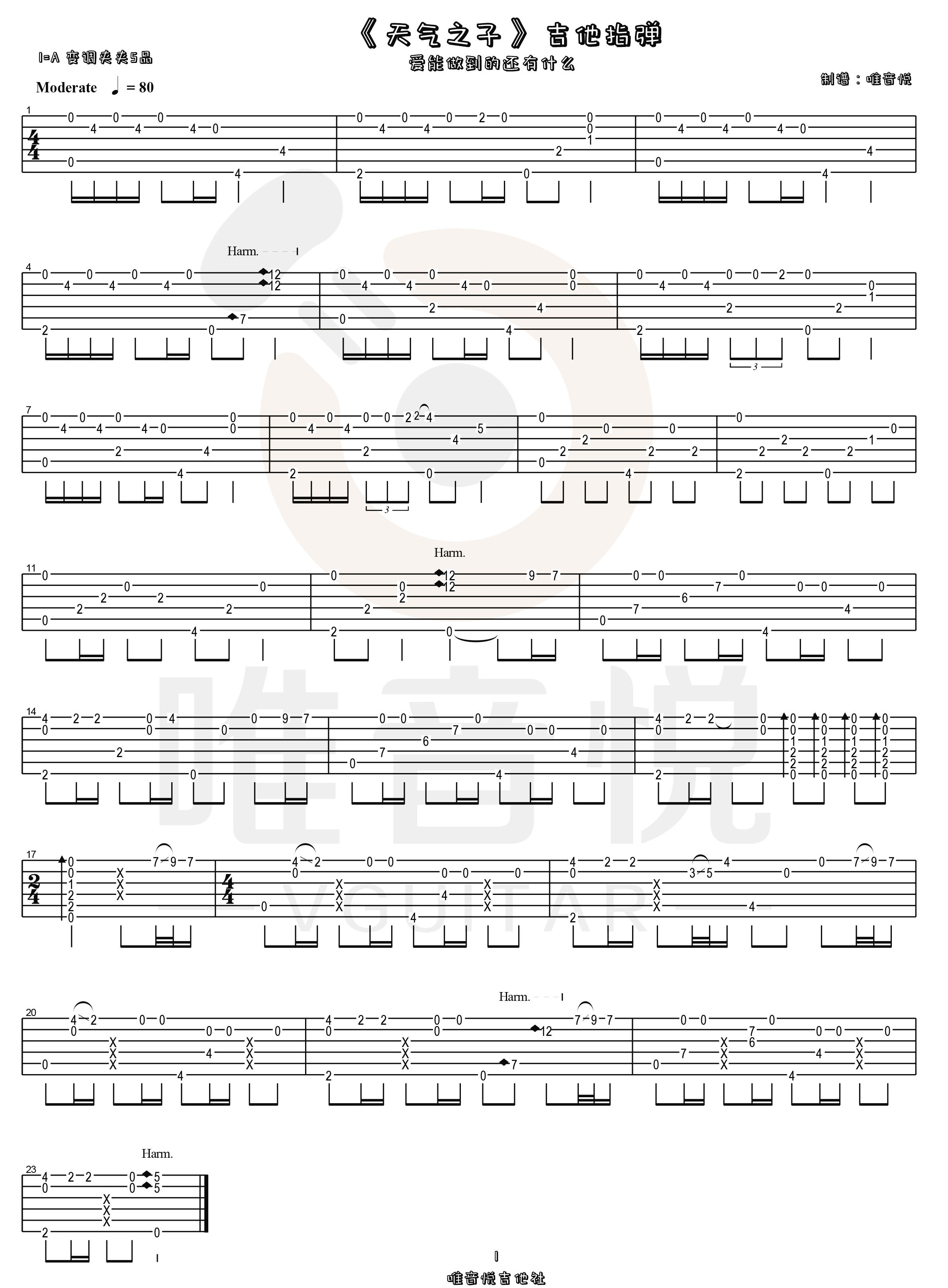 曲谱介绍: 这首曲子采用的是标准调弦,4/4拍的节奏,无需特殊调音。演奏时建议夹变调夹5品,也可根据个人实际情况选择。曲谱由琴谱网更新上传,来源于@唯音悦编配出品。这首歌是新海诚的动画电影《天气之子》的主题曲,其音乐抒情而具有情绪张力的风格,成为了影片创作灵感的一部分。