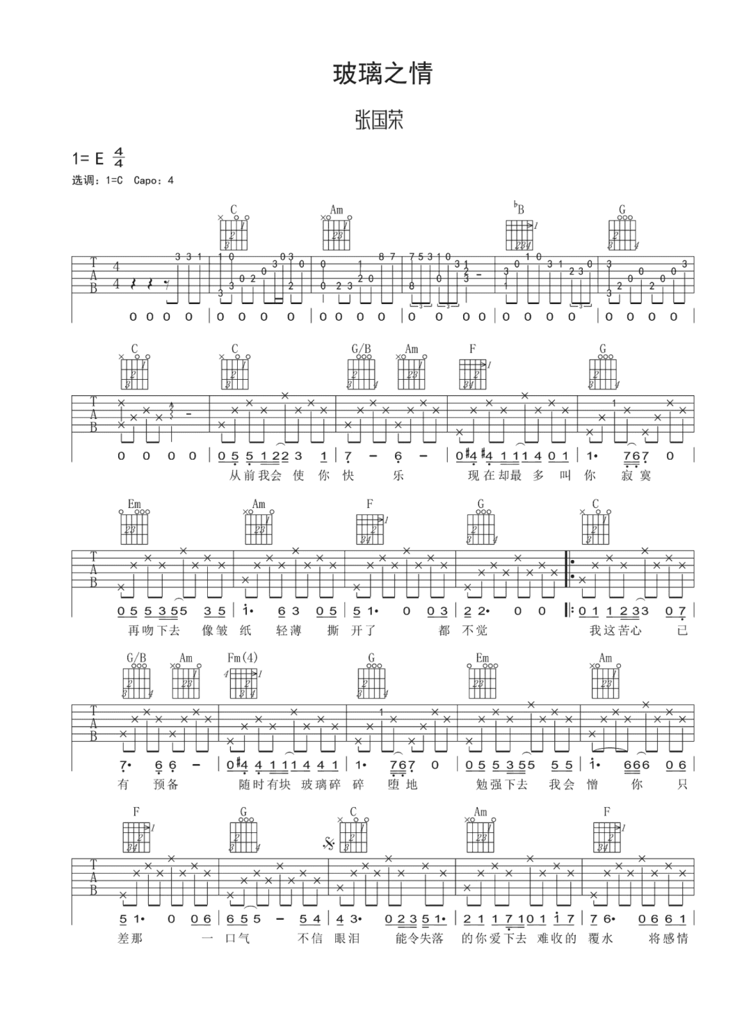玻璃之情吉他谱 - 张国荣 - C调吉他弹唱谱 - 原版