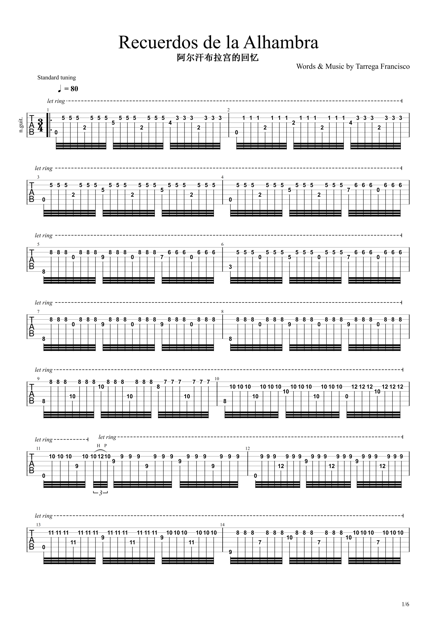 曲谱介绍: Recuerdos de la Alhambra《阿尔汗布拉宫的回忆》吉他谱_C调吉他独奏谱