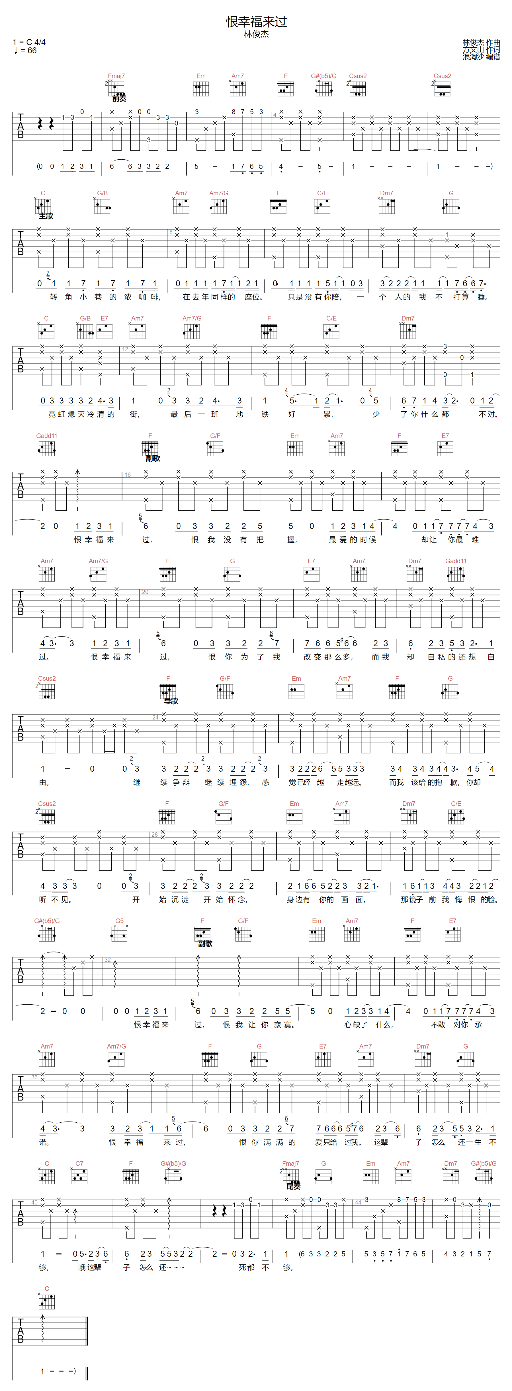 曲谱介绍: 林俊杰演唱的一首歌曲,4/4拍的节奏,这首歌曲的原调为C调,这里曲谱采用了C调指法进行编配,演唱时可不夹变调夹,曲谱由琴谱网更新上传,来源于@浪淘沙编配出品。恨幸福来过,这句话多么的无奈,又在无奈中掺杂着一丝丝遗憾,恨自己让你失望,恨自己对你的伤害,恨你满满的爱只给过我。