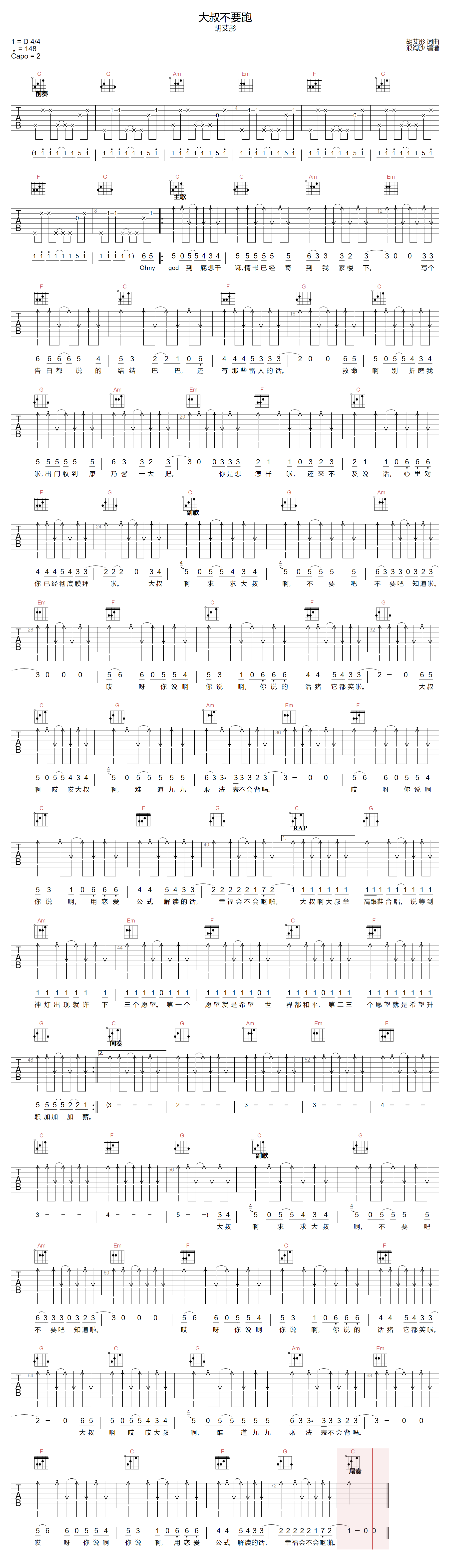 大叔不要跑吉他谱 - 胡艾彤 - C调吉他弹唱谱 - 原版