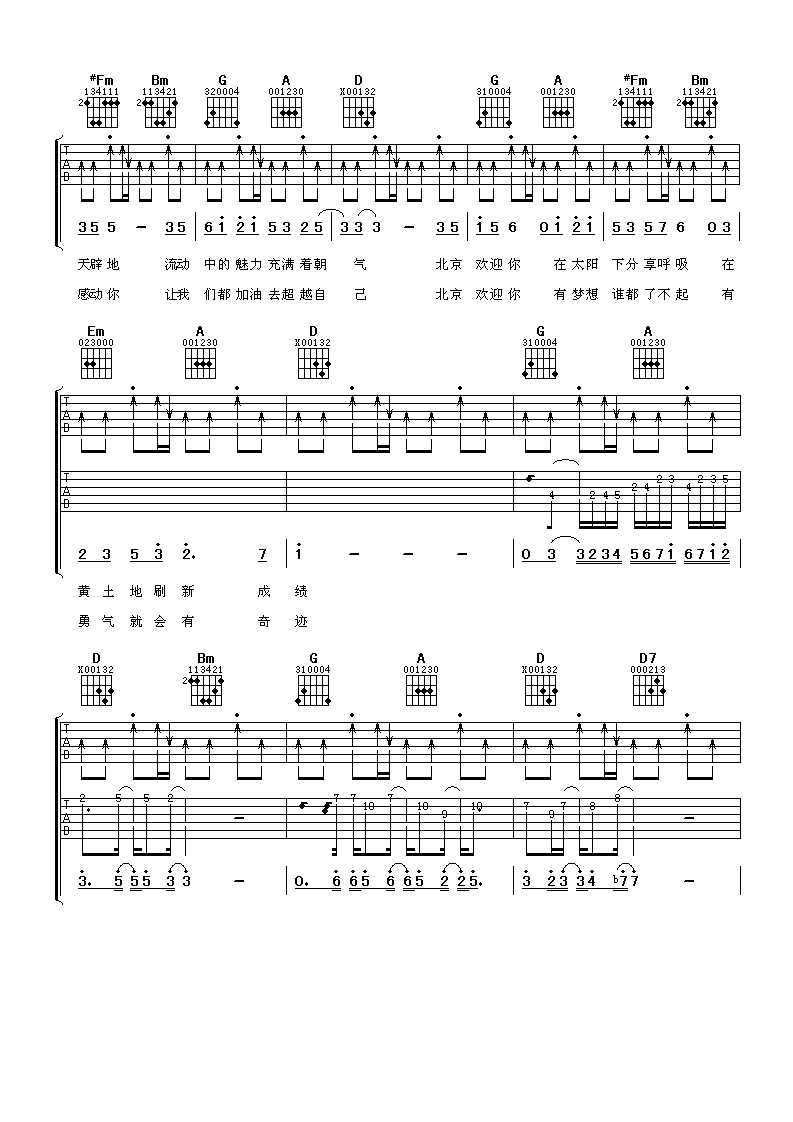 北京欢迎你吉他谱 - 群星 - D调吉他弹唱谱