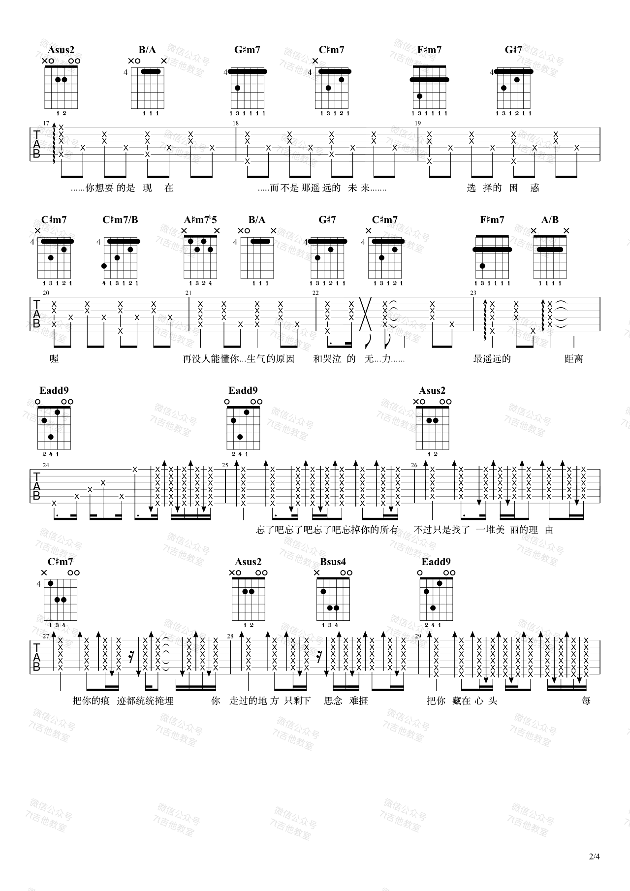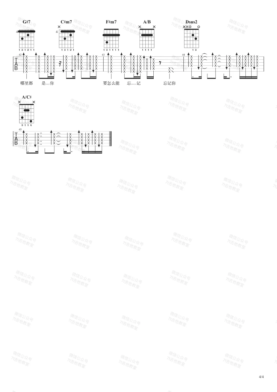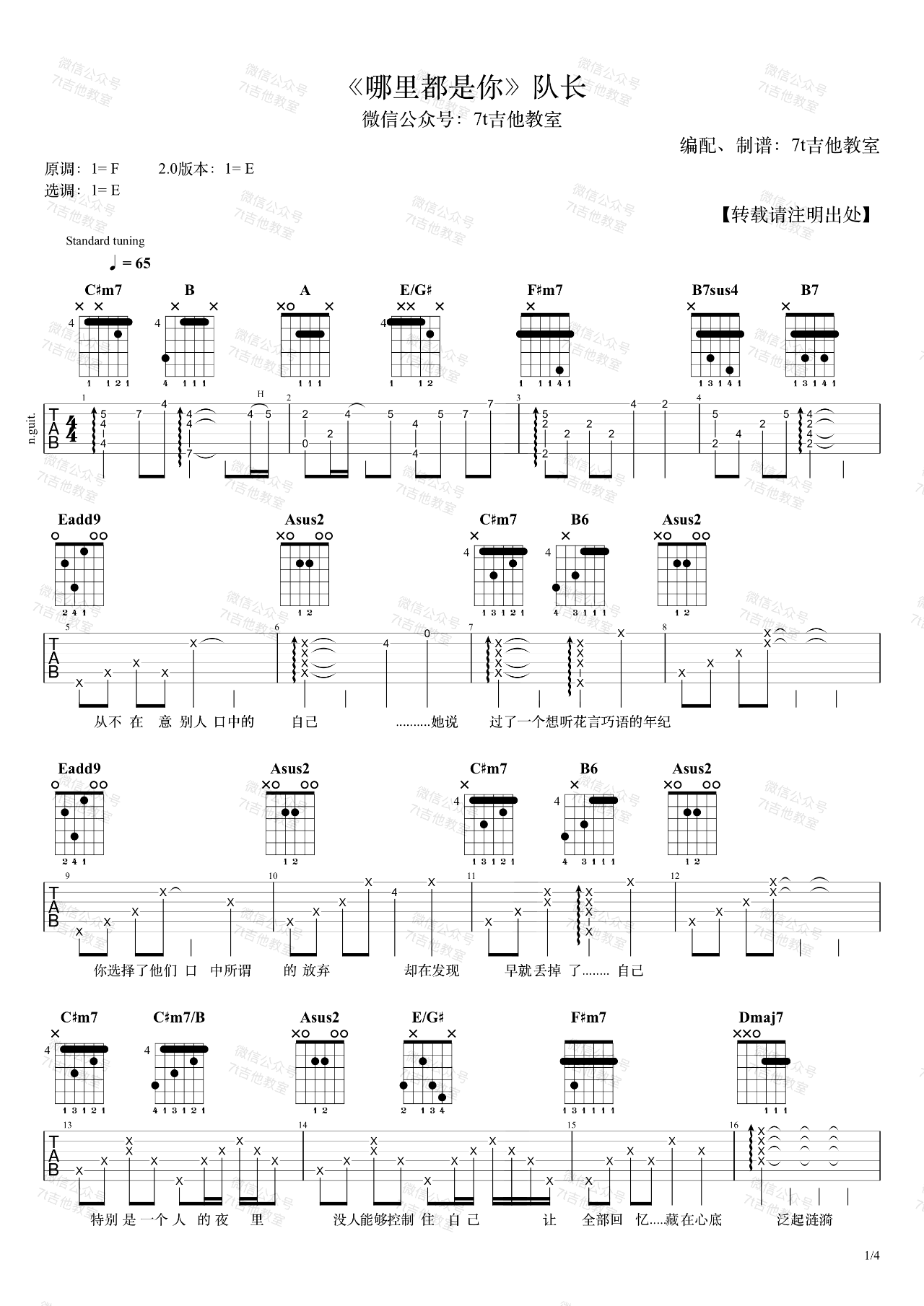 曲谱介绍: 队长演唱的一首歌曲,4/4拍的节奏,这首歌曲的原调为#F调,这里曲谱采用了E调指法进行编配,演唱时夹变调夹2品可回到原调,也可根据个人实际嗓音情况选择。曲谱由琴谱网更新上传,来源于@7T吉他教室编配出品。这首歌其实和周杰伦的《哪里都是你》没有任何关系哈!“我忘掉你的所有,风里雨里一直大步往前走,我又怎么能够忘掉你的温柔,换不同的场景,但那里都是你,要怎么能忘记,忘记你”。