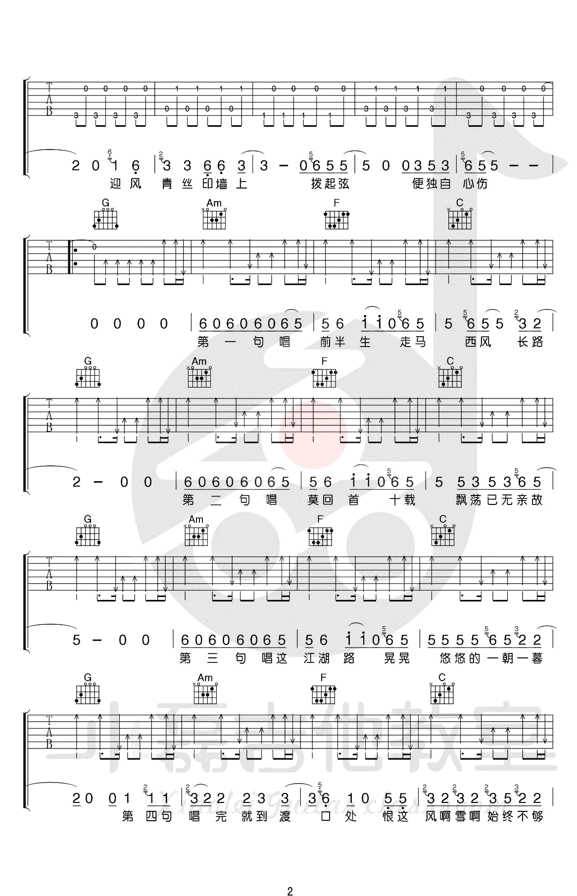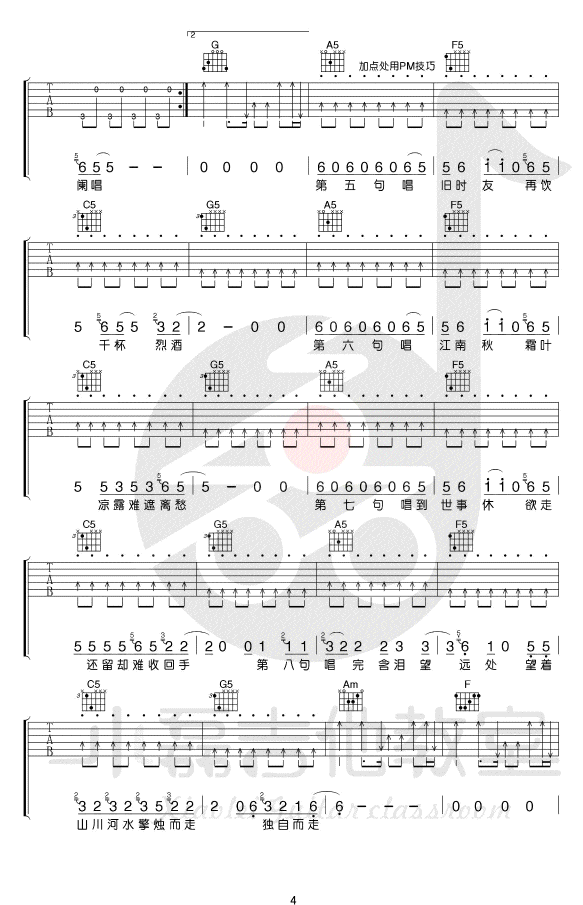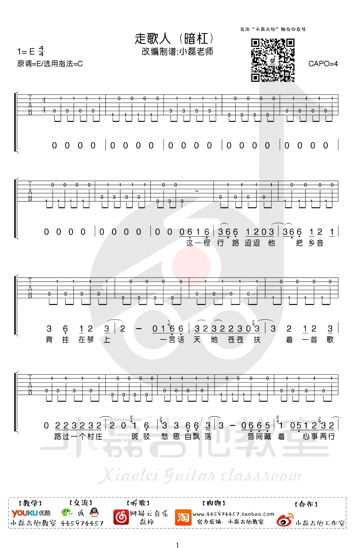 曲谱介绍: 暗杠演唱的一首歌曲,4/4拍的节奏,这首歌曲的原调为E调,这里曲谱采用了C调指法进行编配,演唱时夹变调夹4品可回到原调,也可根据个人实际嗓音情况选择。曲谱由琴谱网更新上传,来源于@小磊吉他编配出品。暗杠的这首《走歌人》像是他在说他的人生,他的故事,不知道为什么,有一股满满的江湖气息,和很多暗杠的歌不同,这首歌不是那种温柔的,而像是独自一人行走江湖的凄凉与洒脱。