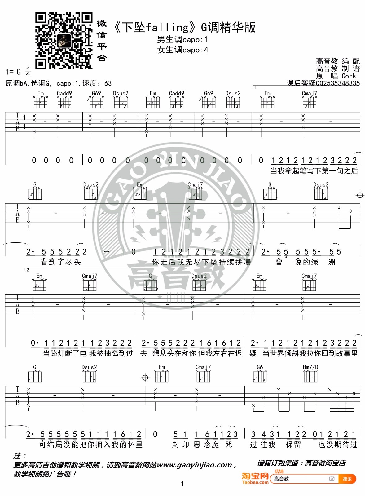 下坠falling吉他谱 - Corki - G调吉他弹唱谱