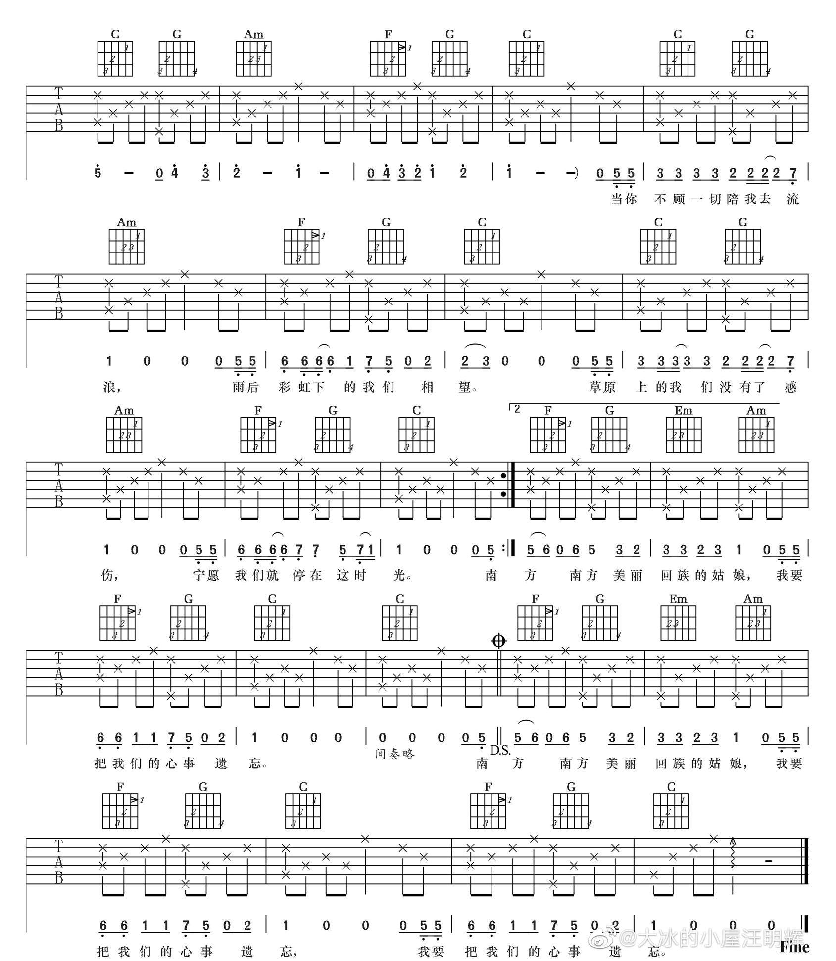 回族姑娘吉他谱 - 汪明辉 - C调吉他弹唱谱 - 原版
