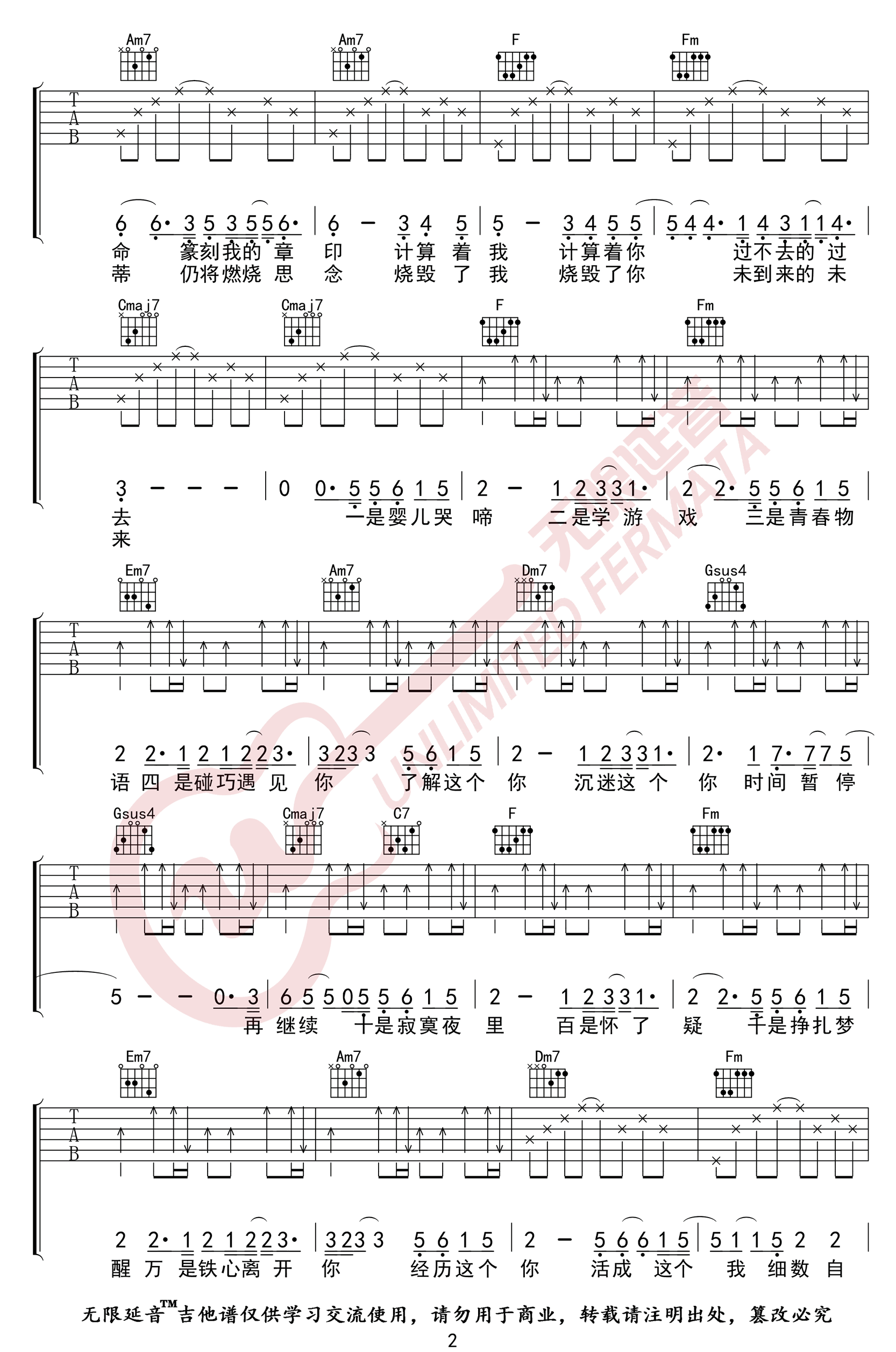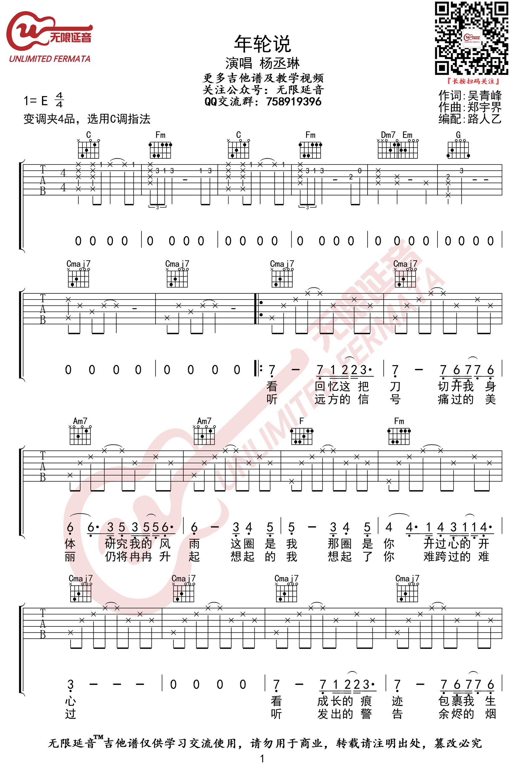 曲谱介绍: 杨丞琳演唱的一首歌曲,4/4拍的节奏,这首歌曲的原调为E调,这里曲谱采用了C调指法进行编配,演唱时夹变调夹4品可回到原调,也可根据个人实际嗓音情况选择。曲谱由琴谱网更新上传,来源于@无限延音编配出品。这首歌是电视剧《荼蘼》的片头曲,歌曲编曲上用了流行音乐里比较少用的乐器—“木管”来贯穿,充满情感却又不俗艳的音色非常符合年轮说这首歌的朴实感。