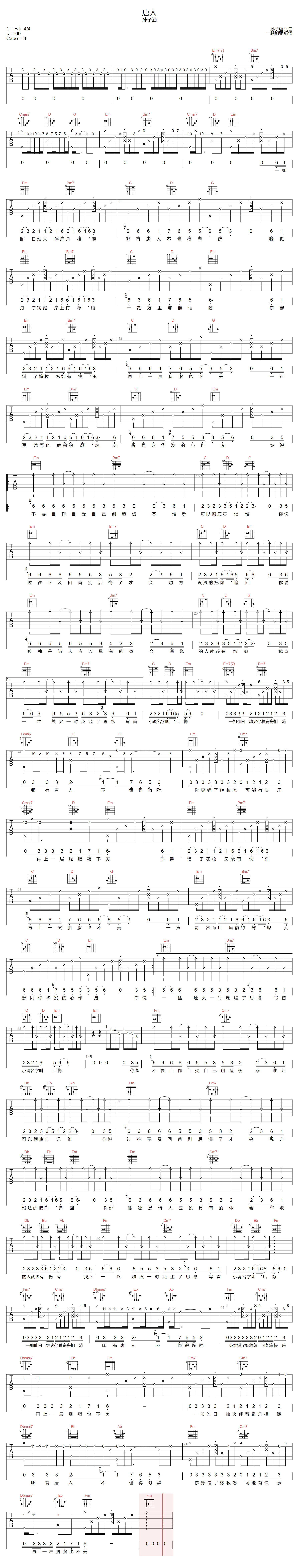 曲谱介绍: 孙子涵演唱的一首歌曲,4/4拍的节奏,这首歌曲的原调为降B调,这里曲谱采用了G调指法进行编配,演唱时夹变调夹3品可回到原调,也可根据个人实际嗓音情况选择。曲谱由琴谱网更新上传,来源于@一颗加菲编配出品。中国风的旋律总是很容易抓人耳朵,这首歌以浓郁的古风,搭配细腻而古色古香的歌词将听者带入了那段刻骨铭心的“唐人”爱情故事中,征服了不少人的心。