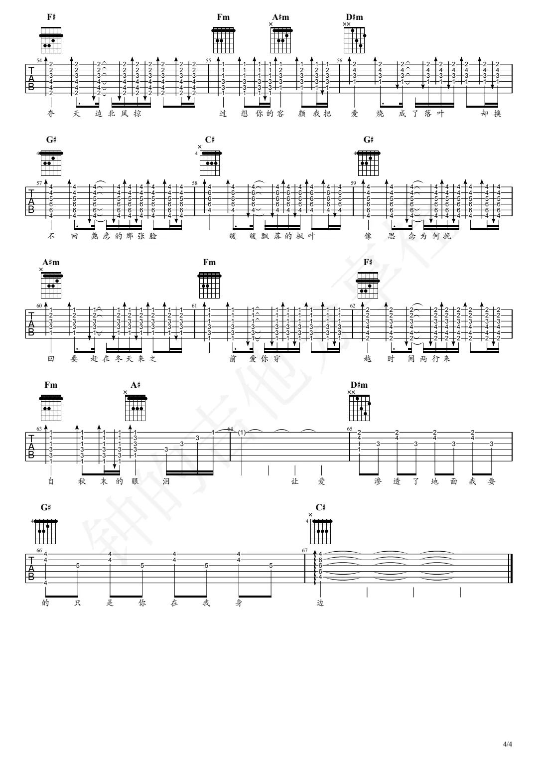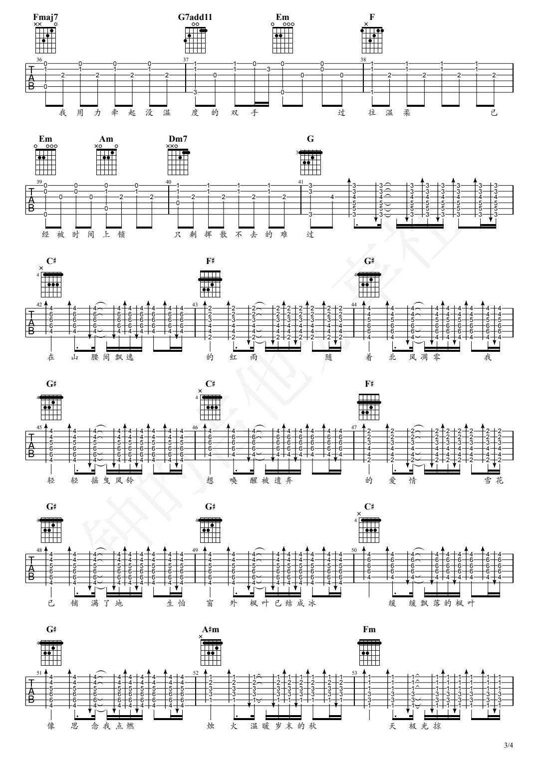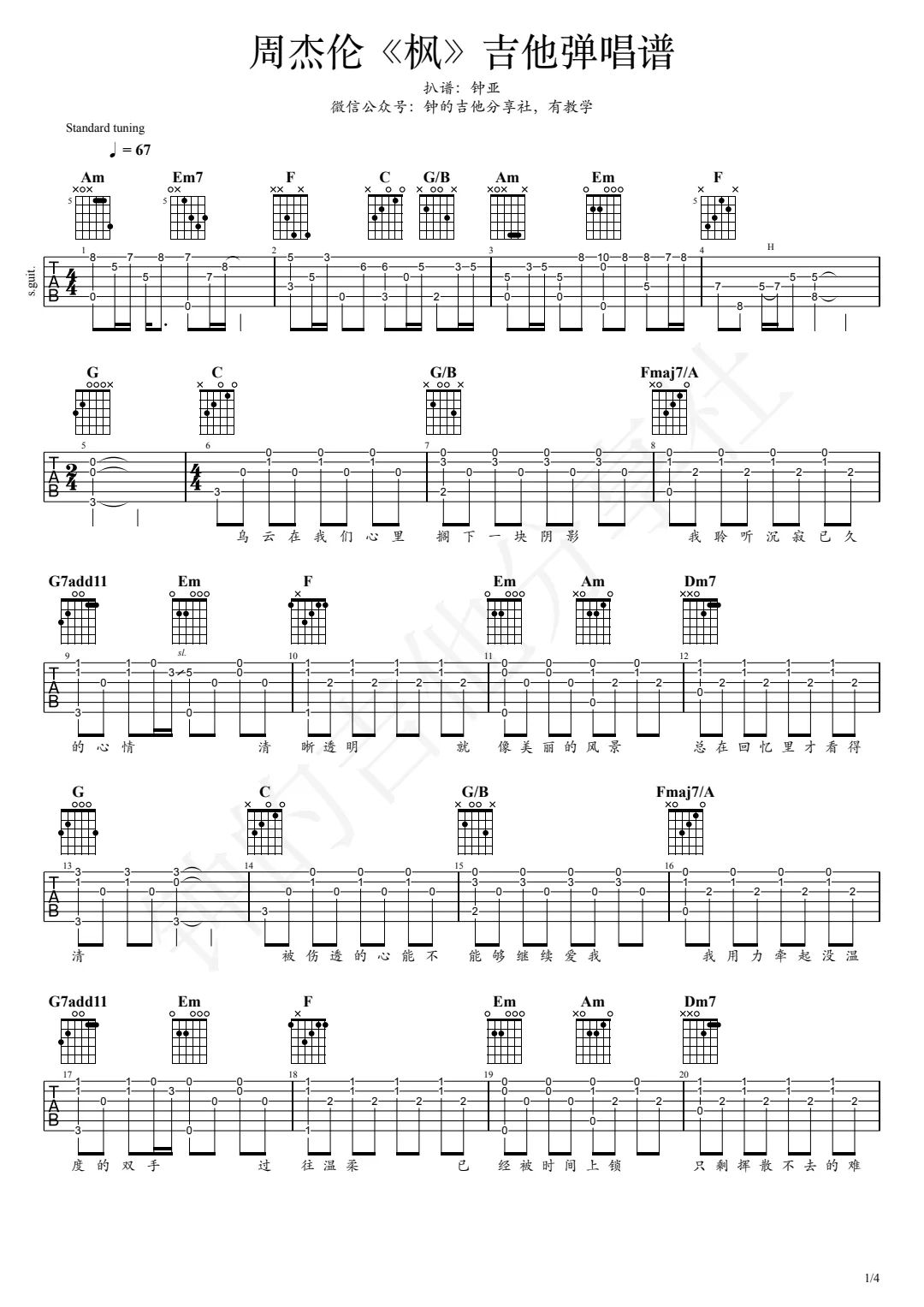 曲谱介绍: 周杰伦的一首指弹吉他曲目,这首曲子采用的是标准调弦,4/4拍的节奏,无需特殊调音。演奏时可不夹变调夹,曲谱由琴谱网更新上传,来源于@钟亚编配出品。