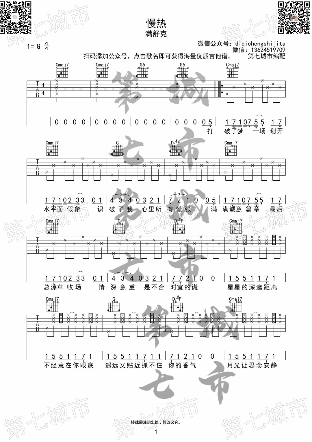 慢热吉他谱 - 满舒克 - G调吉他弹唱谱 - 原版