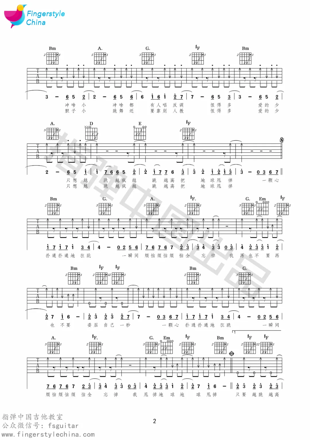 曲谱介绍: 五月天演唱的一首歌曲,4/4拍的节奏,这首歌曲的原调为D调,这里曲谱采用了D调指法进行编配,演唱时可不夹变调夹,曲谱由琴谱网更新上传,来源于@指弹中国编配出品。这首歌感觉很轻松活跃,没有那么多的压力,好像是宿舍去ktv的时候都会点这首歌,即有一种释放的感觉,又很轻松。