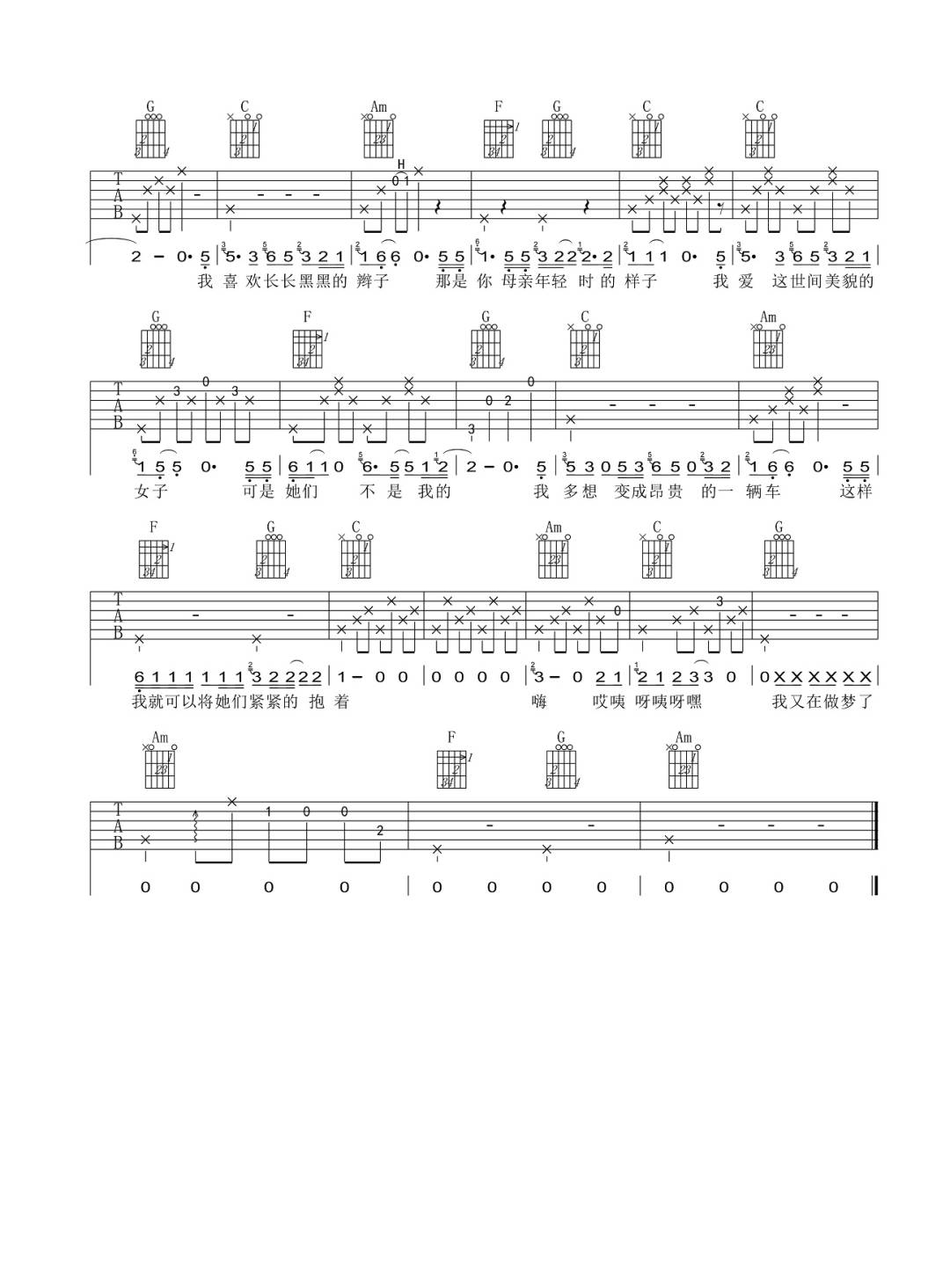曲谱介绍: 赵雷演唱的一首歌曲,4/4拍的节奏,这首歌曲的原调为F调,这里曲谱采用了C调指法进行编配,演唱时夹变调夹5品可回到原调,也可根据个人实际嗓音情况选择。曲谱由琴谱网更新上传,曲谱来源于网络转载,编配制谱者暂不详。这首歌是赵雷在完全喝醉状态下写的一首歌,一开口,声音中就带着酒后完全的释放和洒脱。一整段苦闷的旋律和呐喊过后,情绪突然转变,最后却又巧妙地回到原点,仿佛酒后的一场大梦。