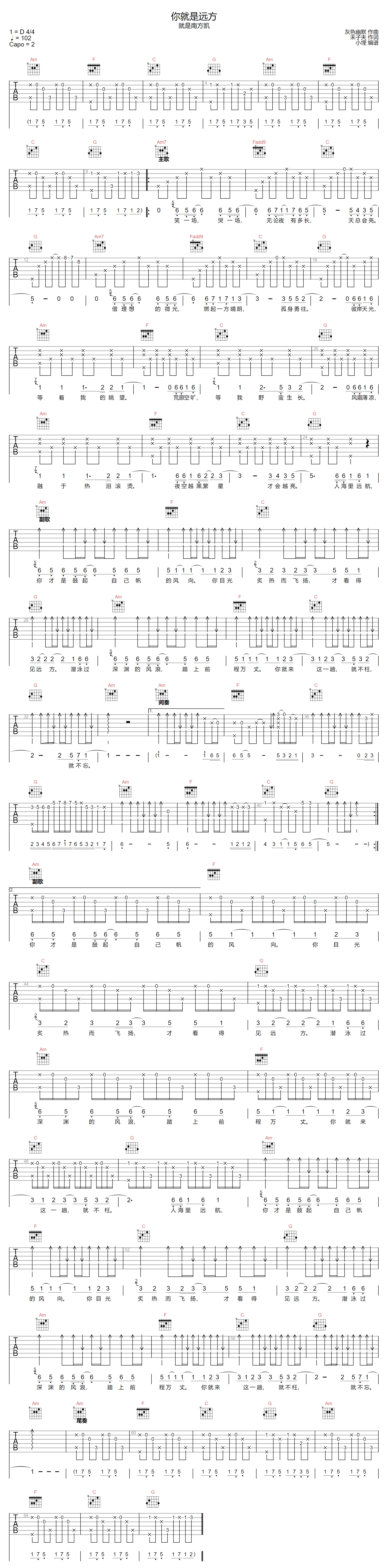 曲谱介绍: 就是南方凯演唱的一首歌曲,4/4拍的节奏,这首歌曲的原调为D调,这里曲谱采用了C调指法进行编配,演唱时夹变调夹2品可回到原调,也可根据个人实际嗓音情况选择。曲谱由琴谱网更新上传,来源于@小埋编配出品。这是一首扣人心弦的歌曲,以美妙的旋律和深情的歌词编织出一幅动人的画卷。歌曲唤起了每个人内心深处的渴望,勾勒出了一个个追逐远方、实现梦想的故事。