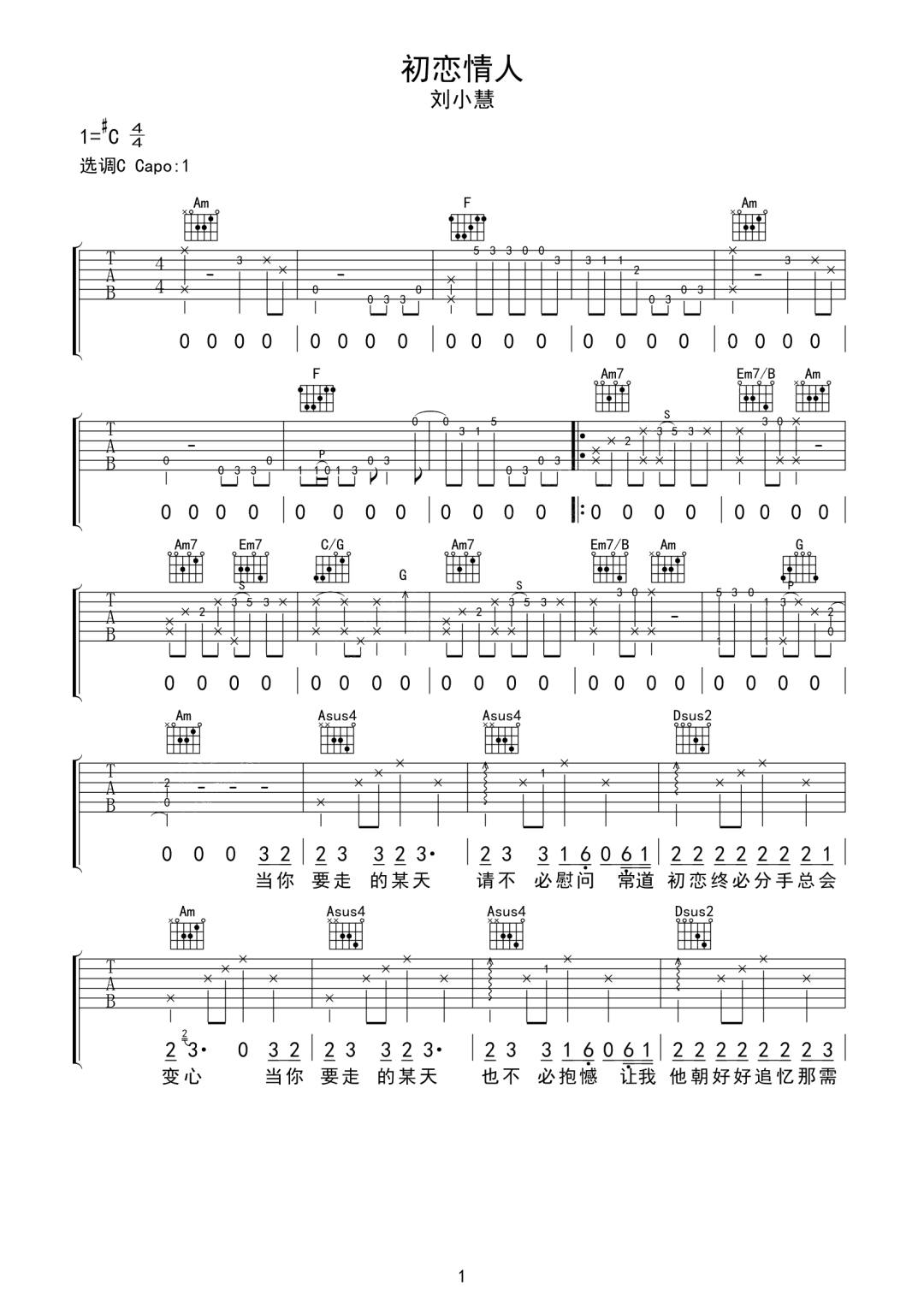 初恋情人吉他谱 - 刘小慧 - C调吉他弹唱谱 - 原版