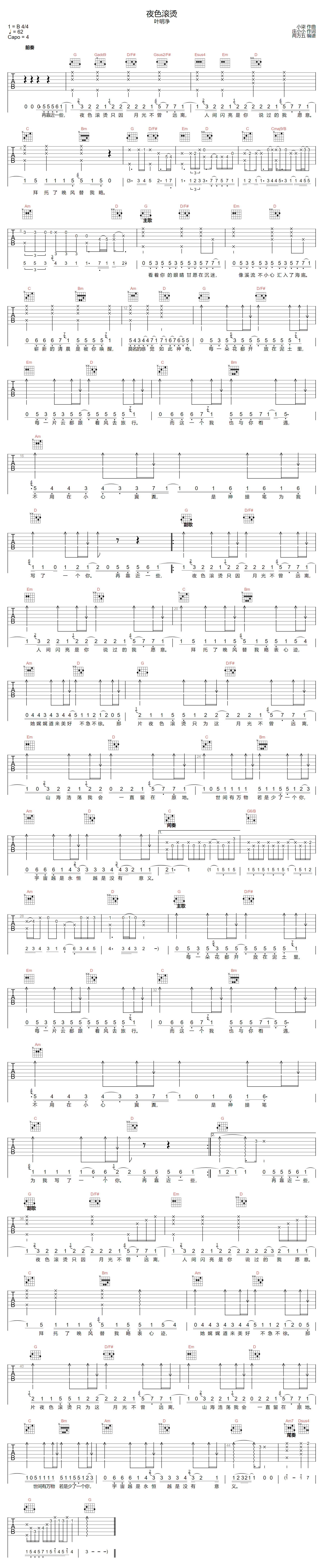 曲谱介绍: 叶明净演唱的一首歌曲,4/4拍的节奏,这首歌曲的原调为B调,这里曲谱采用了G调指法进行编配,演唱时夹变调夹4品可回到原调,也可根据个人实际嗓音情况选择。曲谱由琴谱网更新上传,来源于@两万五编配出品。“夜色滚烫,只因月光不曾远离,人间闪亮是你,说过的我愿意,拜托了晚风,替我略表心迹,她娓娓道来美好不急不徐,那片夜色滚烫,只为这月光不曾远离。”