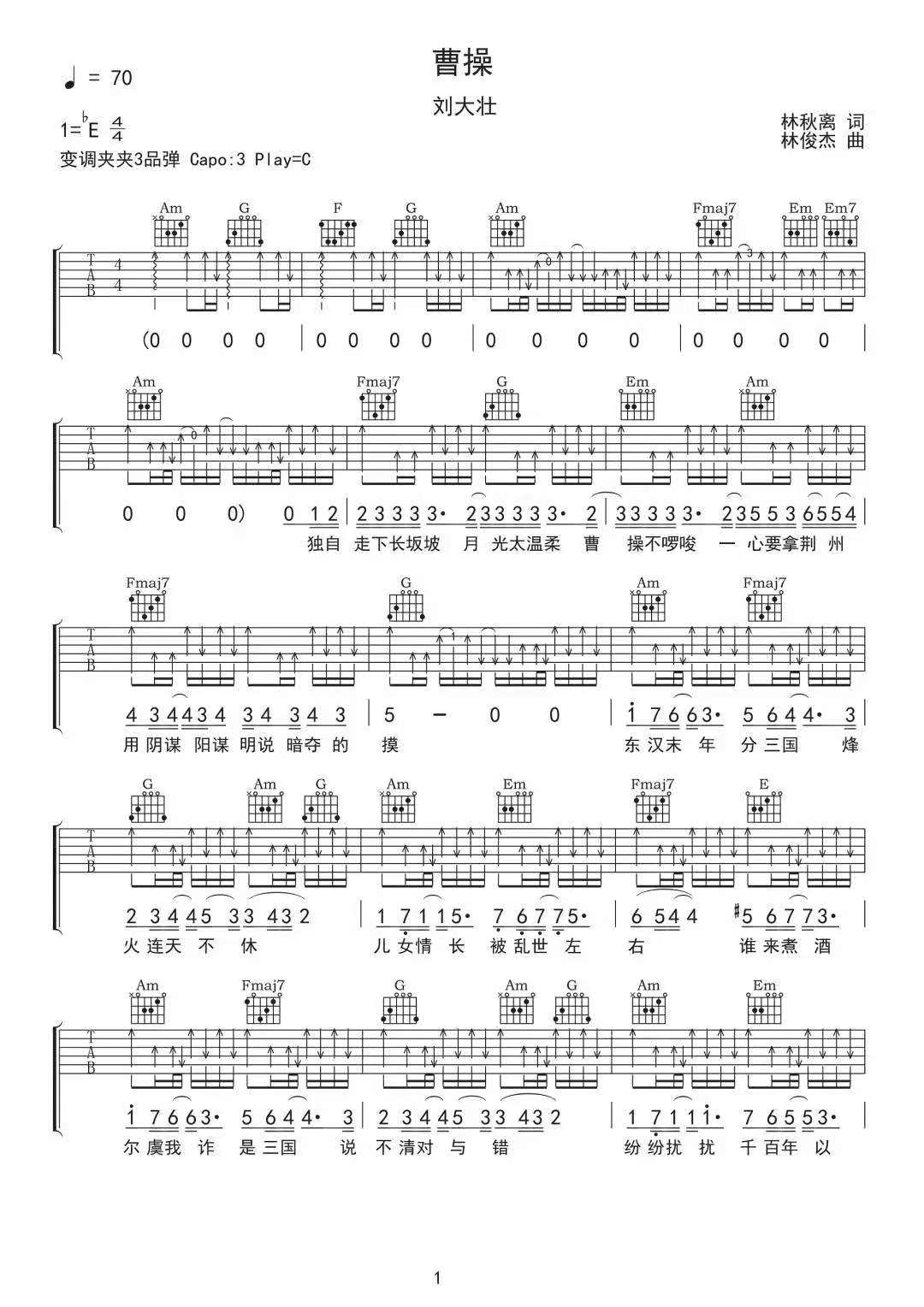 曹操吉他谱 - 刘大壮 - C调吉他弹唱谱 - 原版
