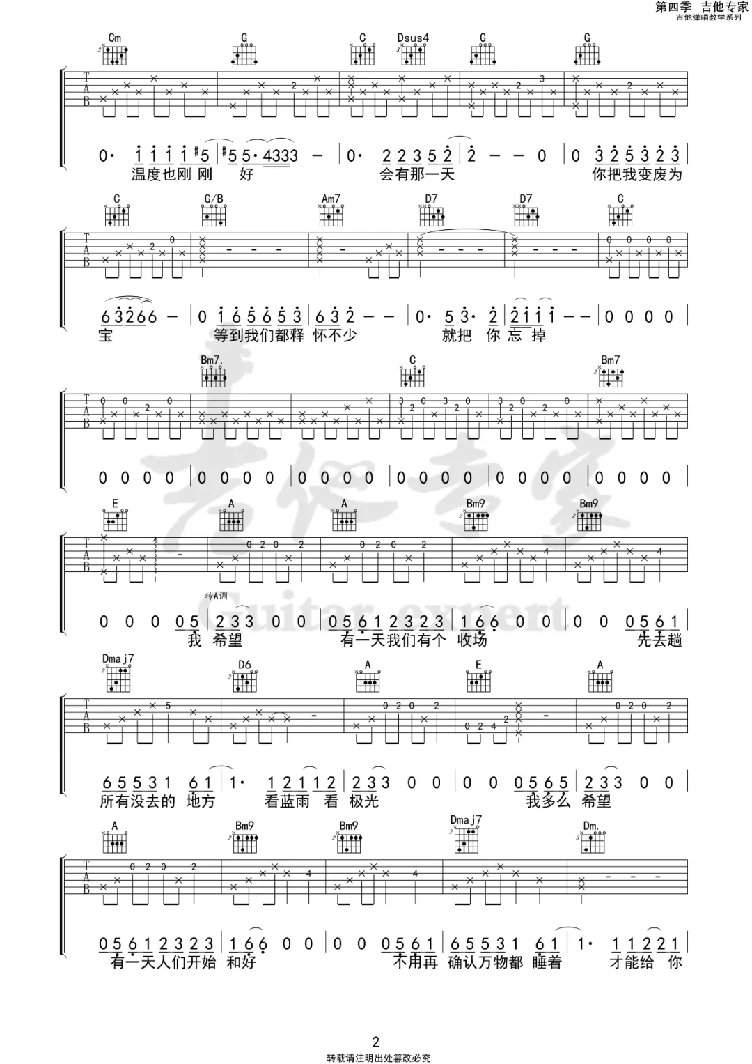 曲谱介绍: 薛之谦演唱的一首歌曲,4/4拍的节奏,这首歌曲的原调为B调,这里曲谱采用了G调指法进行编配,演唱时夹变调夹4品可回到原调,也可根据个人实际嗓音情况选择。曲谱由琴谱网更新上传,来源于@吉他专家编配出品。这首歌有着双重的含义,表层是与所爱之人,追求那份浪漫、追寻极光与星海,是放手之后的平静。而内在里,是对世界环境的,当然也包括思想、观念、情感从疏离变和谐的期盼。