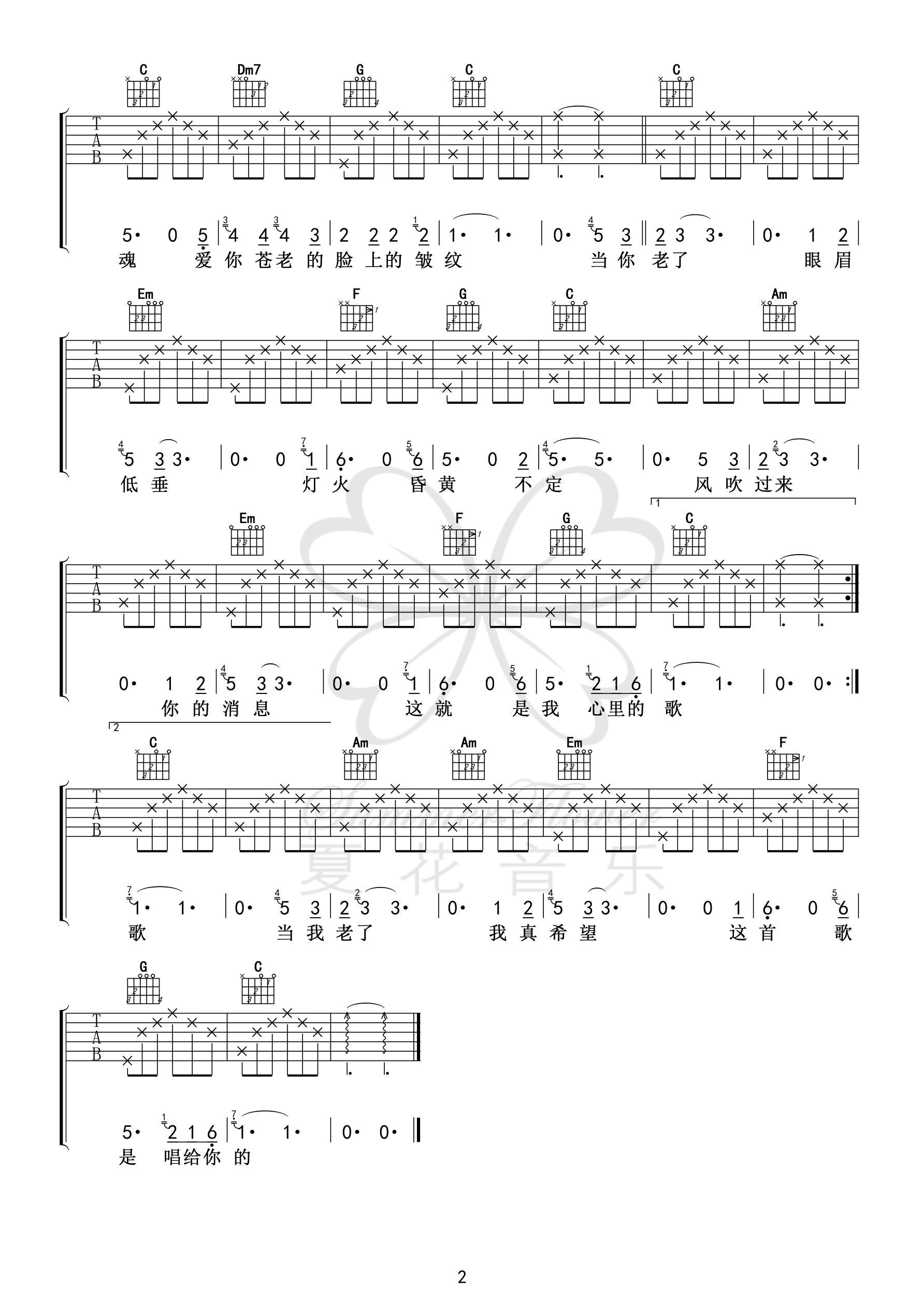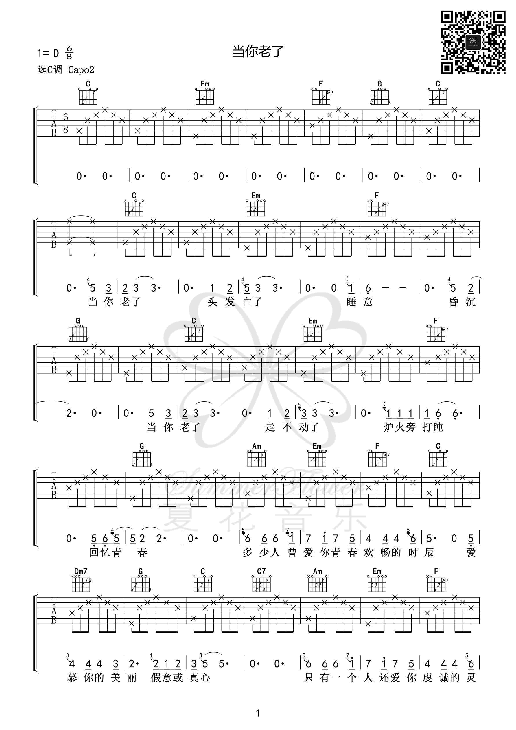 曲谱介绍: 赵照演唱的一首歌曲,6/8拍的节奏,这首歌曲的原调为D调,这里曲谱采用了C调指法进行编配,演唱时夹变调夹2品可回到原调,也可根据个人实际嗓音情况选择。曲谱由琴谱网更新上传,来源于@夏花音乐编配出品。这首歌很容易让人潸然泪下,尤其是他充满沙哑的声音加上歌曲的主旋律让这首歌更加的伤感。那么你呢?当你老了,是否还有人爱着你那虔诚的灵魂?