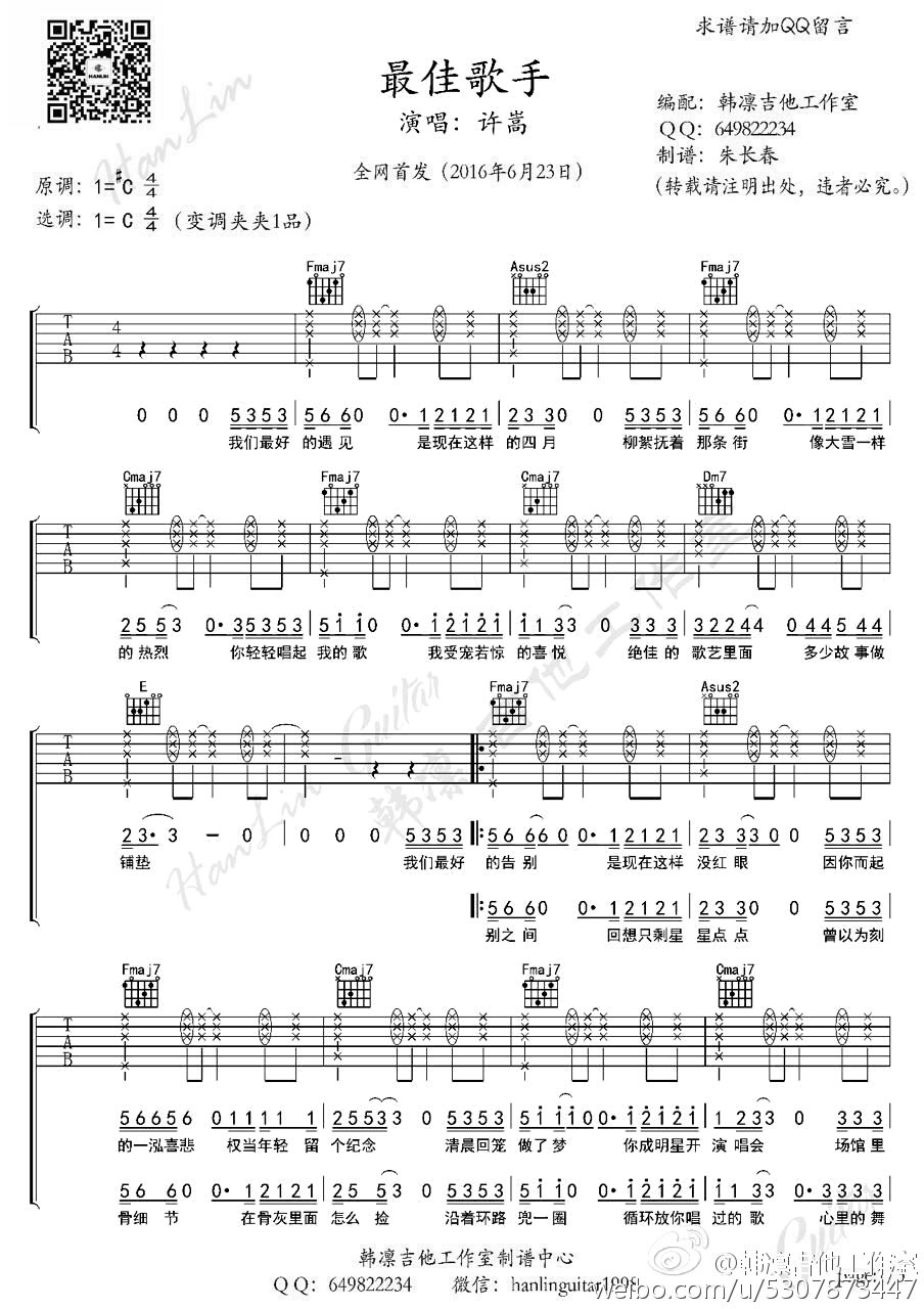 曲谱介绍: 许嵩演唱的一首歌曲,4/4拍的节奏,这首歌曲的原调为#C调,这里曲谱采用了C调指法进行编配,演唱时夹变调夹1品可回到原调,也可根据个人实际嗓音情况选择。曲谱由琴谱网更新上传,来源于@韩凛吉他工作室编配出品。就像很多感情一样,忽然就开始了,忽然就结束了,没什么前奏尾奏的。每个人都有一个自己认定的“最佳歌手”,任他/她离自己多遥远,却始终常驻心中。