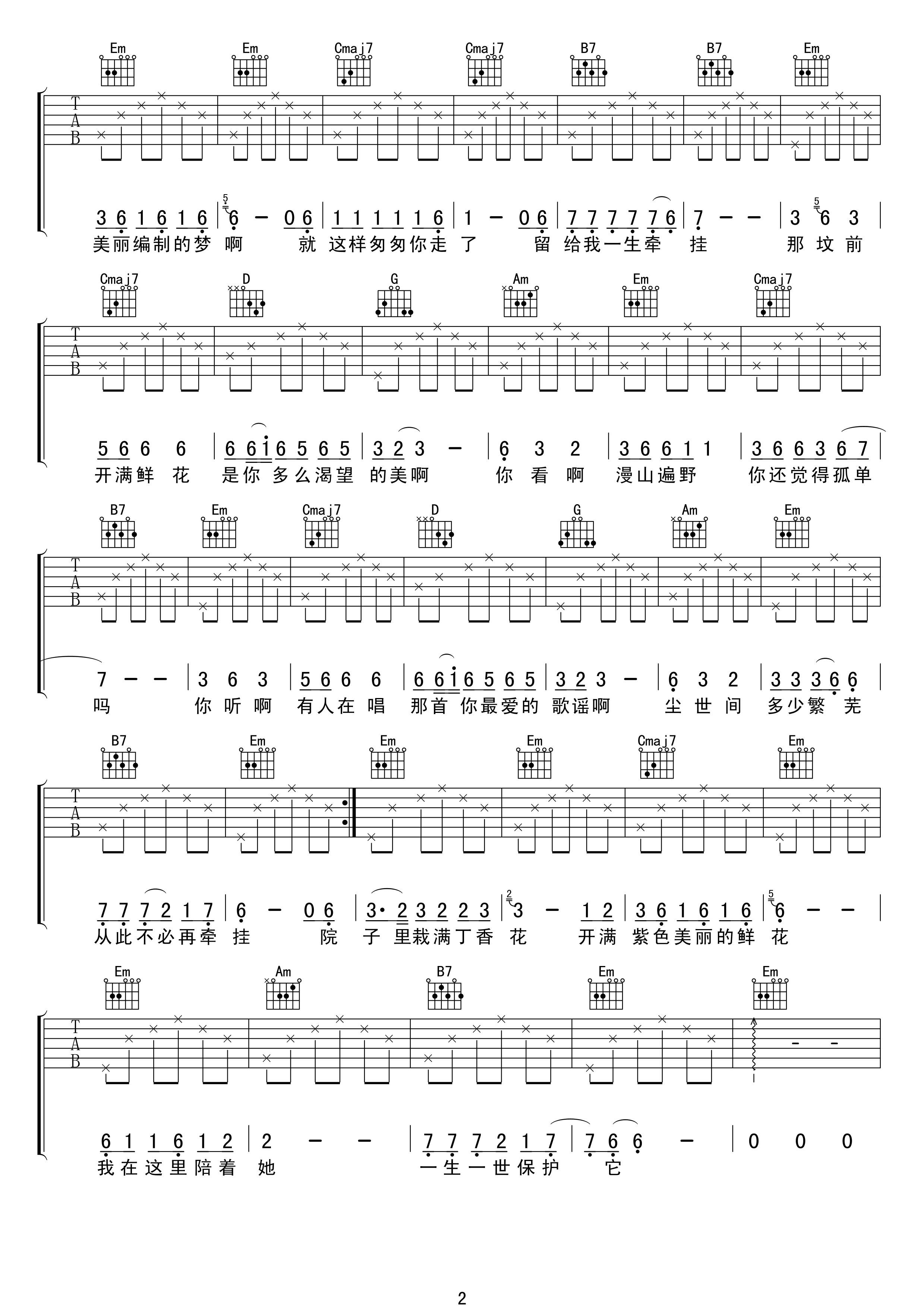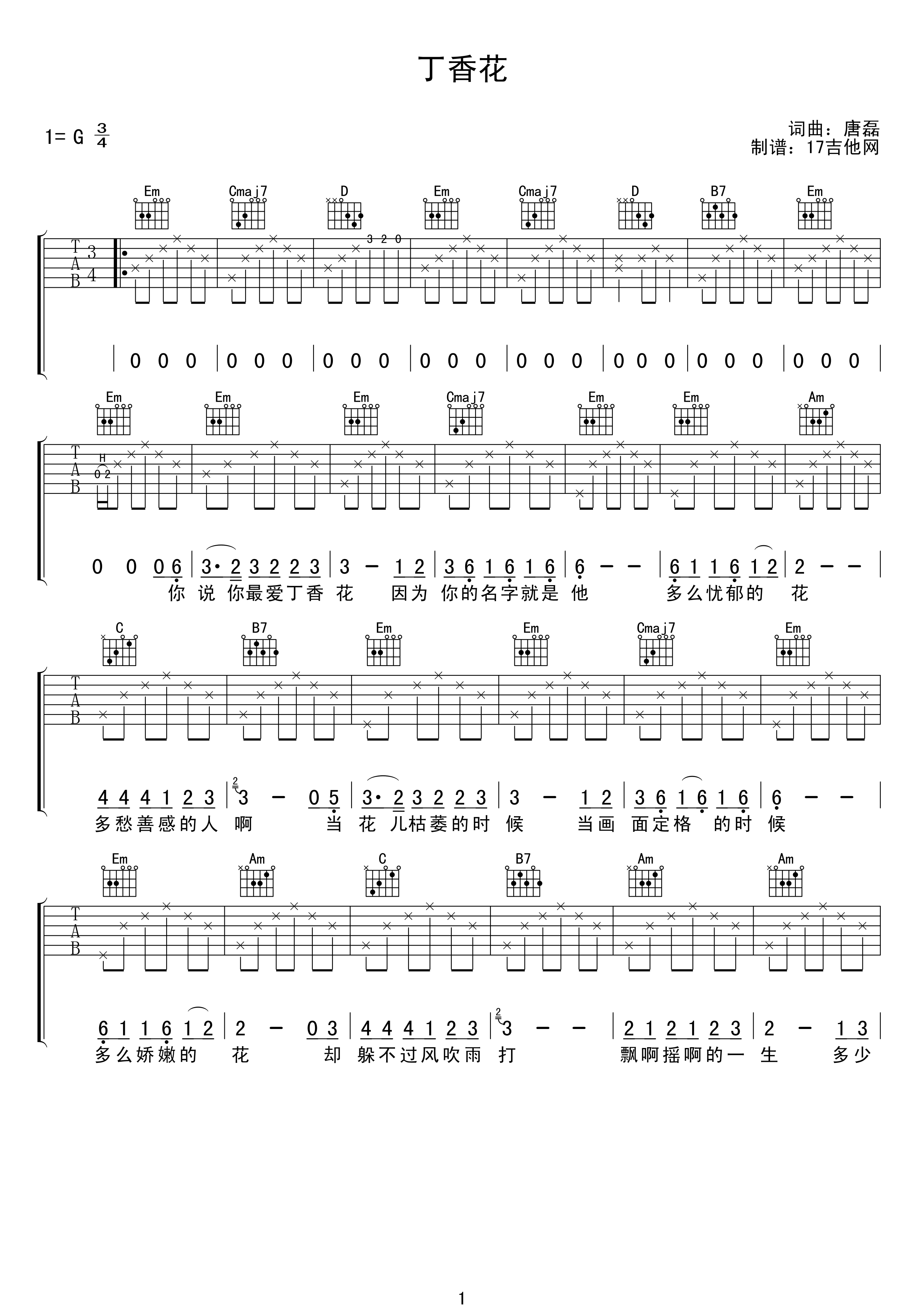 曲谱介绍: 唐磊演唱的一首歌曲,3/4拍的节奏,这首歌曲的原调为G调,这里曲谱采用了G调指法进行编配,演唱时可不夹变调夹,曲谱由琴谱网更新上传,曲谱来源于网络转载,编配制谱者暂不详。这首歌完成于2000年,而上传在2002年间,这首歌旋律朴素自然、旋律动人,特别是前面的一个双滑音,非常好听。