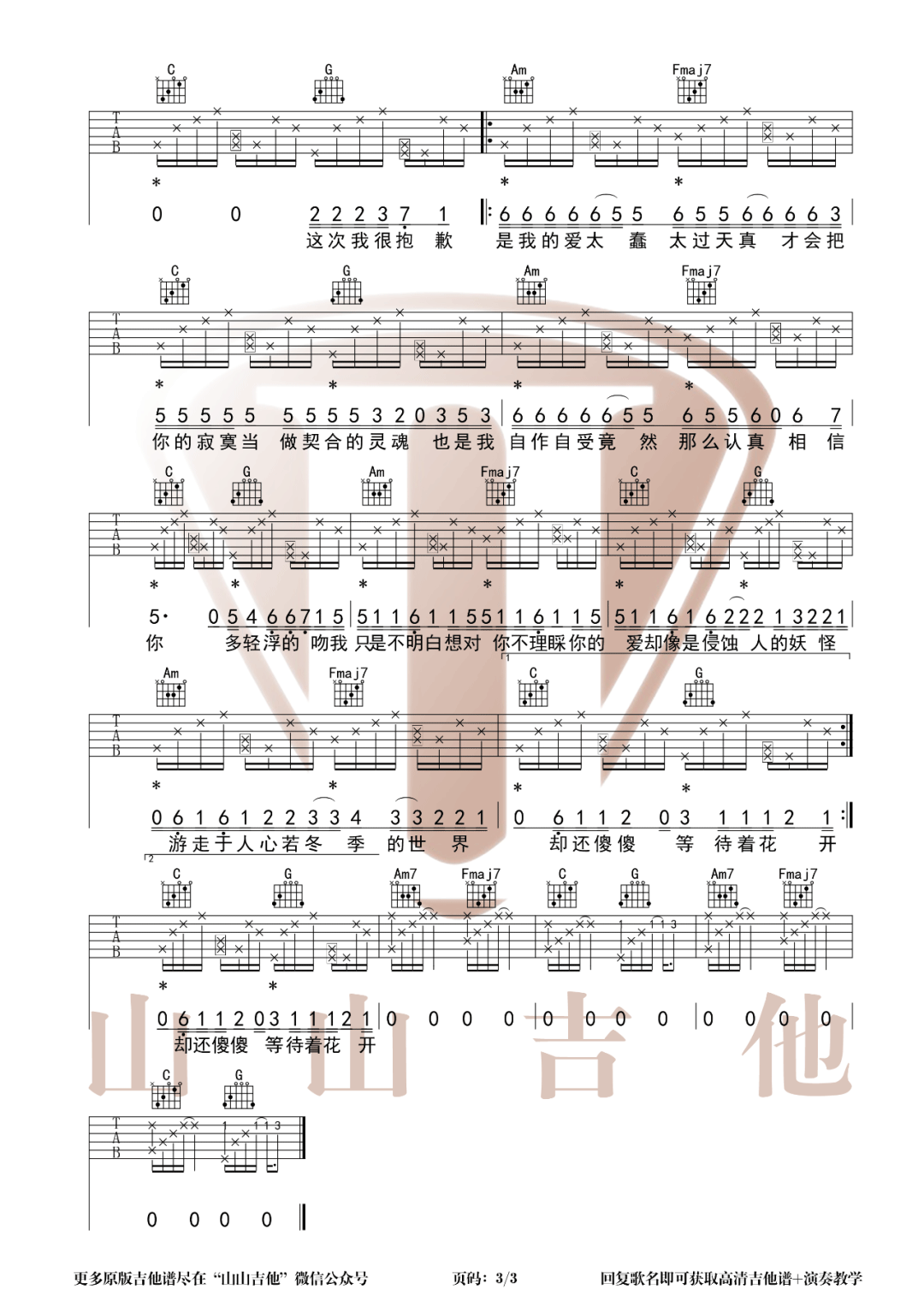 曲谱介绍: 王忻辰演唱的一首歌曲,4/4拍的节奏,这首歌曲的原调为E调,这里曲谱采用了C调指法进行编配,演唱时夹变调夹4品可回到原调,也可根据个人实际嗓音情况选择。曲谱由琴谱网更新上传,来源于@山山吉他编配出品。歌曲音质低沉微颤,整体听上去自然而不着痕迹。男女之间的爱情,即美丽浪漫又伴随着烦恼。彼此都相互深深吸引着,但又无法忍受对方的忽冷忽热。